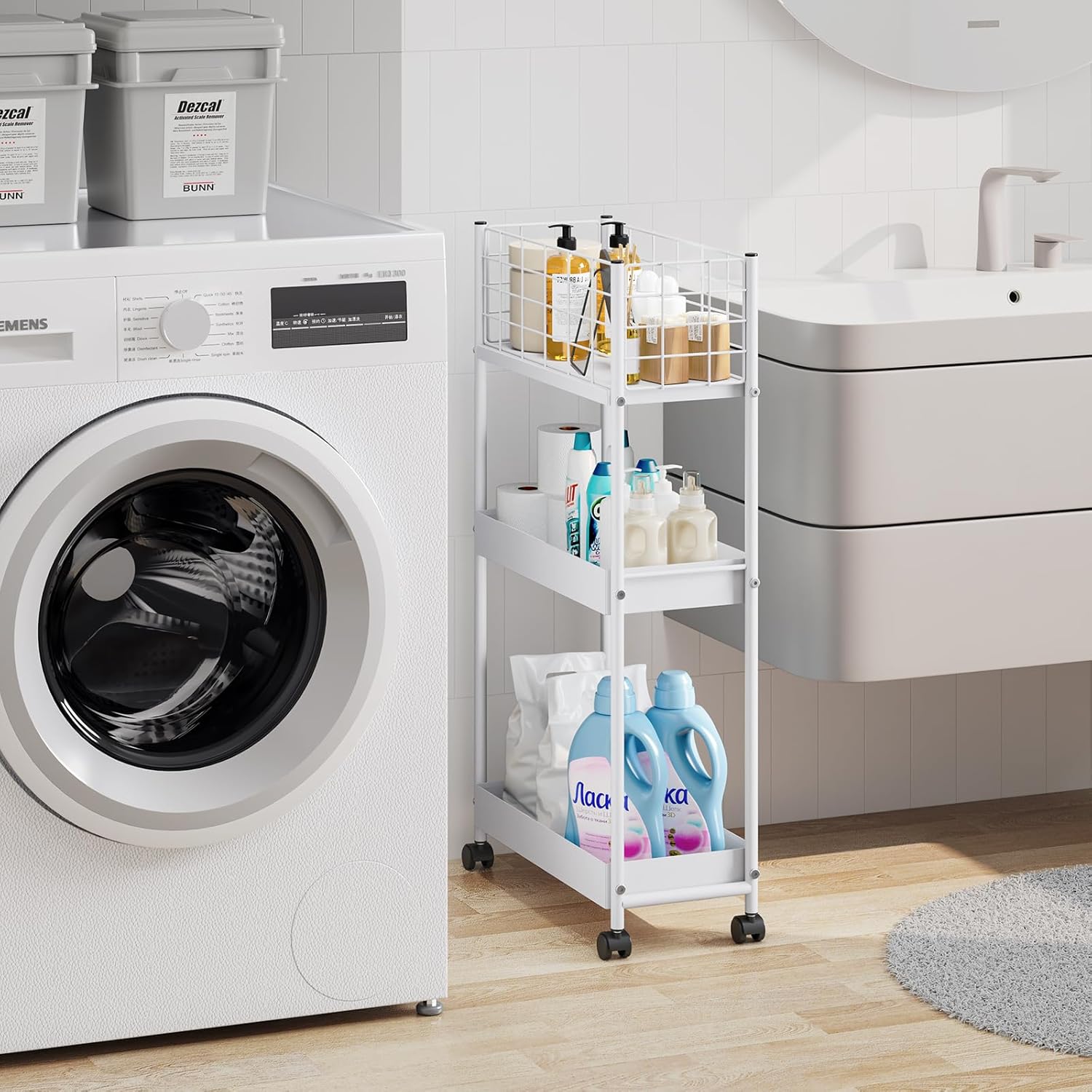 - FLEXIBLE MOBILITY: The slim storage bathroom rolling utility cart is equipped with 360°rotating wheels, the storage cart can be moved to any corner of the house to store items. You can flexibly use it for storage in office, bathroom, laundry room, kitchen, narrow places,etc.