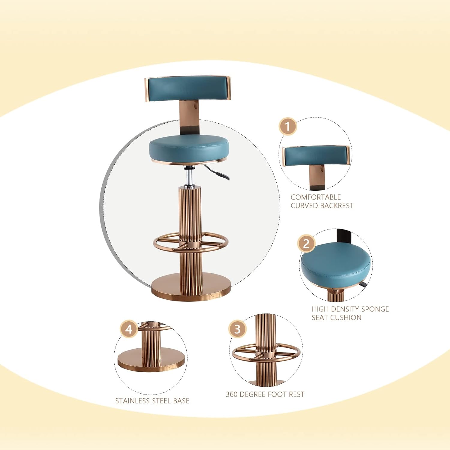 FUNROLUX Swivel Bar Stools with Backrest, Modern Adjustable Height Counter Stool with Stainless Steel Legs and Comfortable Cushion, Rose Bar Chairs for Kitchen Island Counter (Blue)