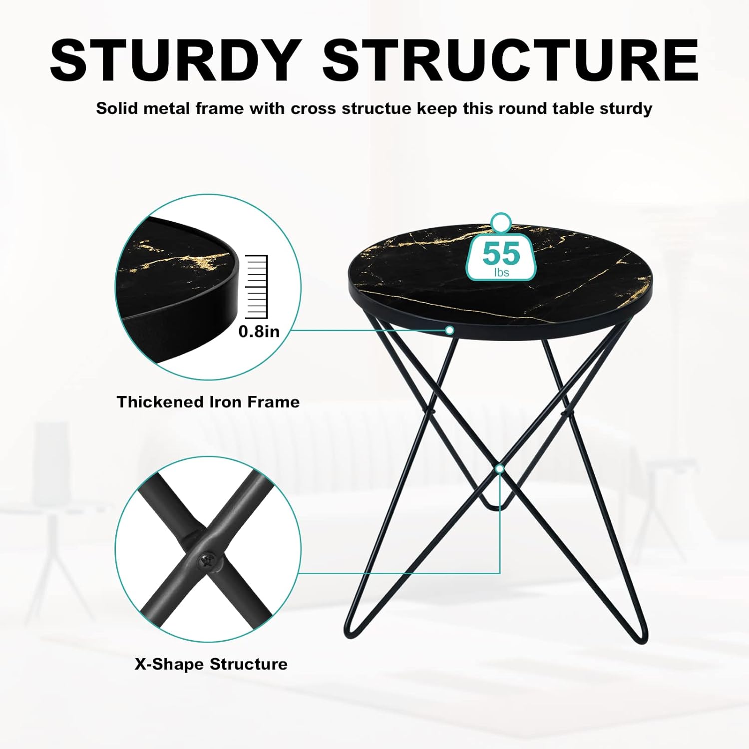HLR Modern Round Side Table Set of 2, End Table with Marble Effect Top and Gold Metal Frame, Small Side Table for Living Room, Bedroom, Sofa and Couch, Black Legs, Black Marble top