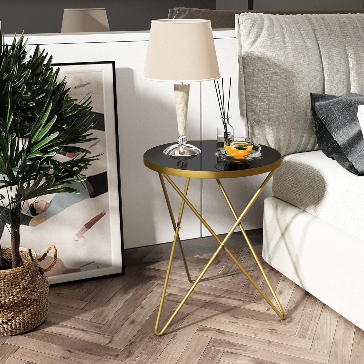 HLR Modern Round Side Table Set of 2, End Table with Marble Effect Top and Gold Metal Frame, Small Side Table for Living Room, Bedroom, Sofa and Couch, Gold Legs, Black Glass top