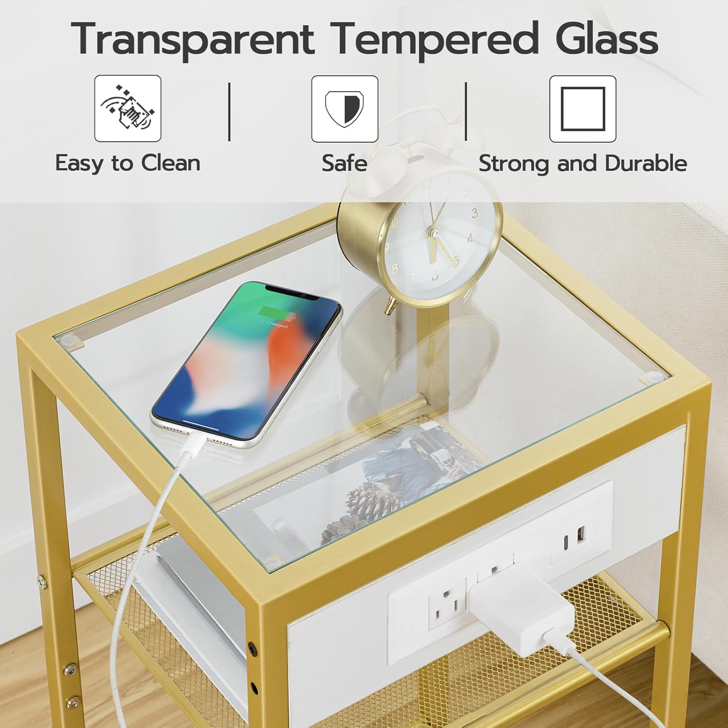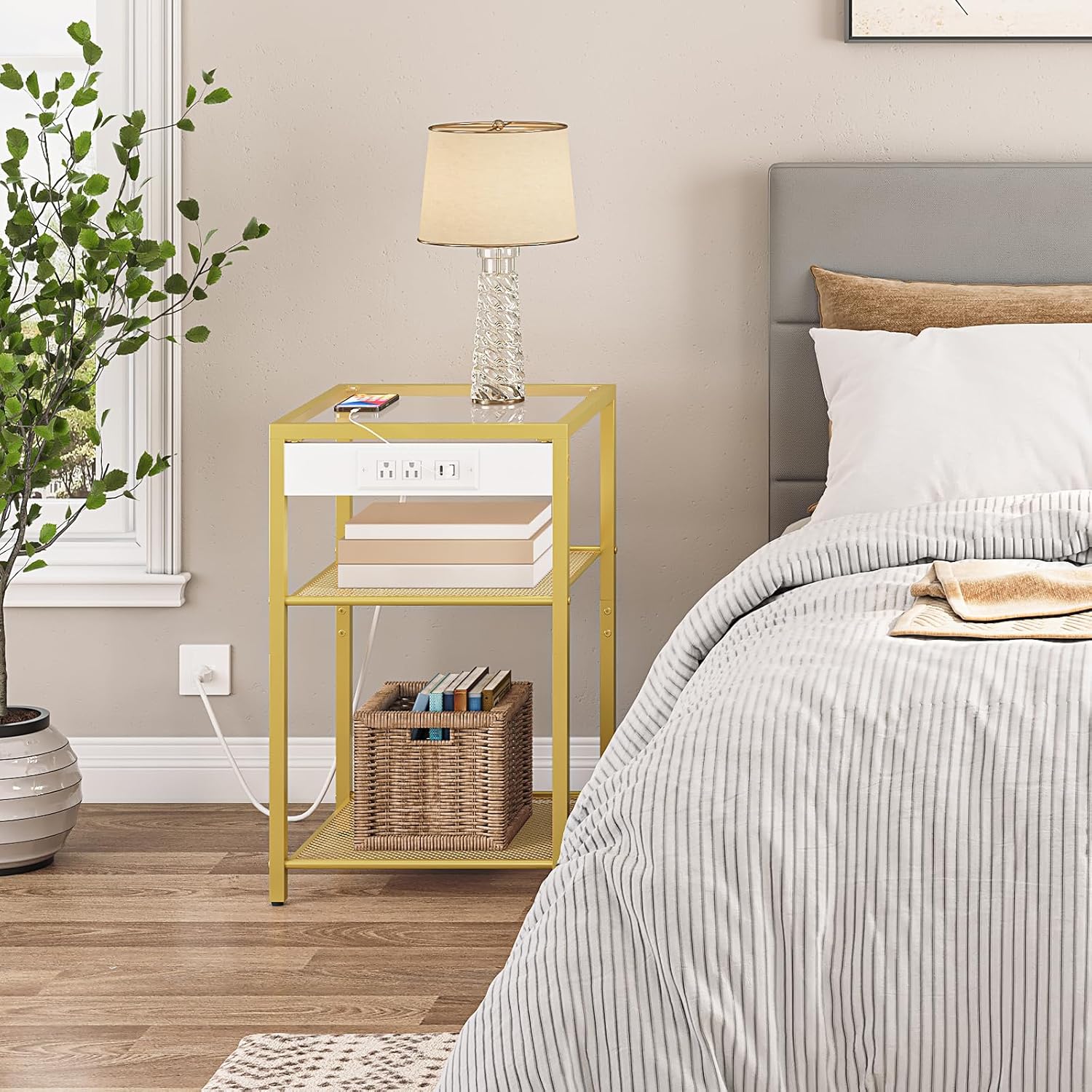 HOOBRO End Table with Charging Station, Side Table with USB Port & Power Outlets, 3-Tier Slim Nightstand with Storage Shelves, Tempered Glass, for Living Room, Bedroom, Gold GD77UBZ01