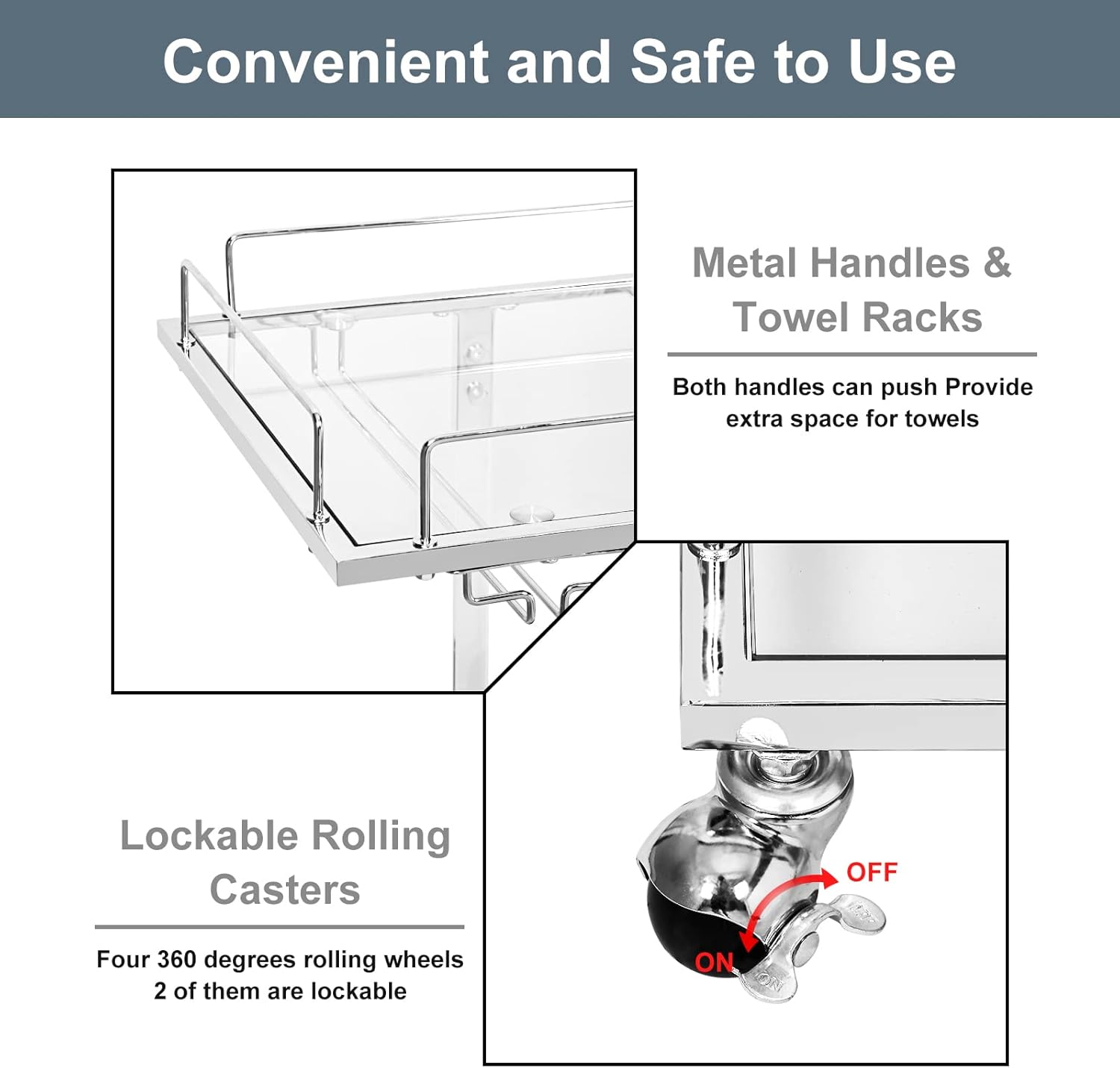 - Lockable Casters & Free Handle :This mini bar with universal wheels flexible rolling,durable,smooth and silent,no damage to the floor and could rotate 360 degrees,two of them with brakes.In addition,the upper tier with safety rails can be as handle lets you push and control the rolling cart effortlessly.