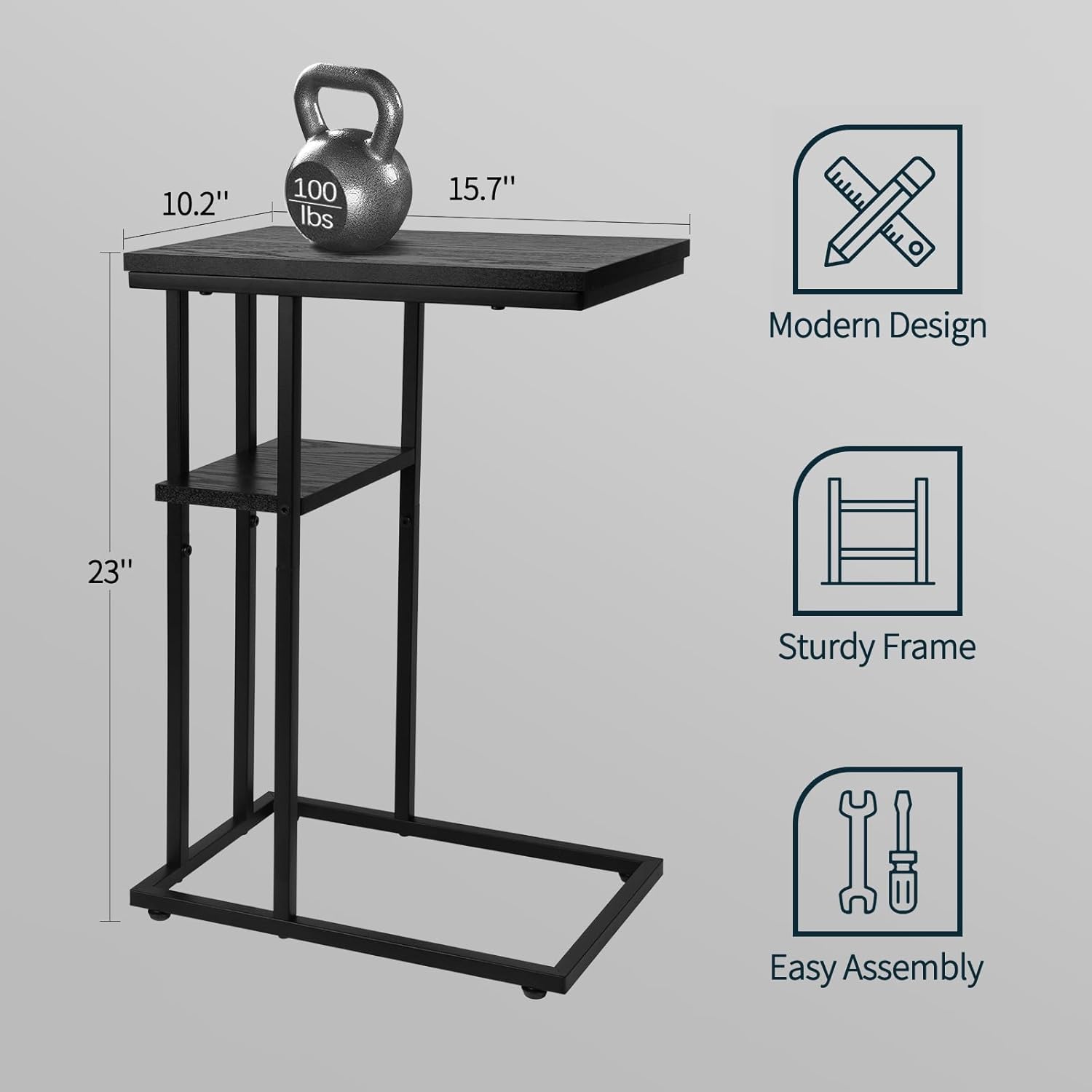 - C Shaped Design: The C table is easy to slide into the underside of the couch, bed or chair, allowing you to conveniently use it without getting up. Meanwhile, the compact C-shaped design also makes it a perfect small end table for small spaces. Ergonomic 24” height offers you a comfortable experience for working from home.