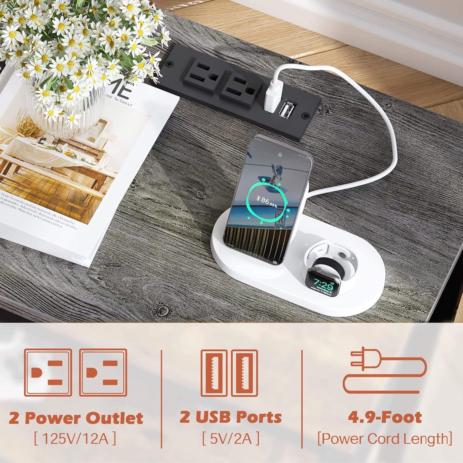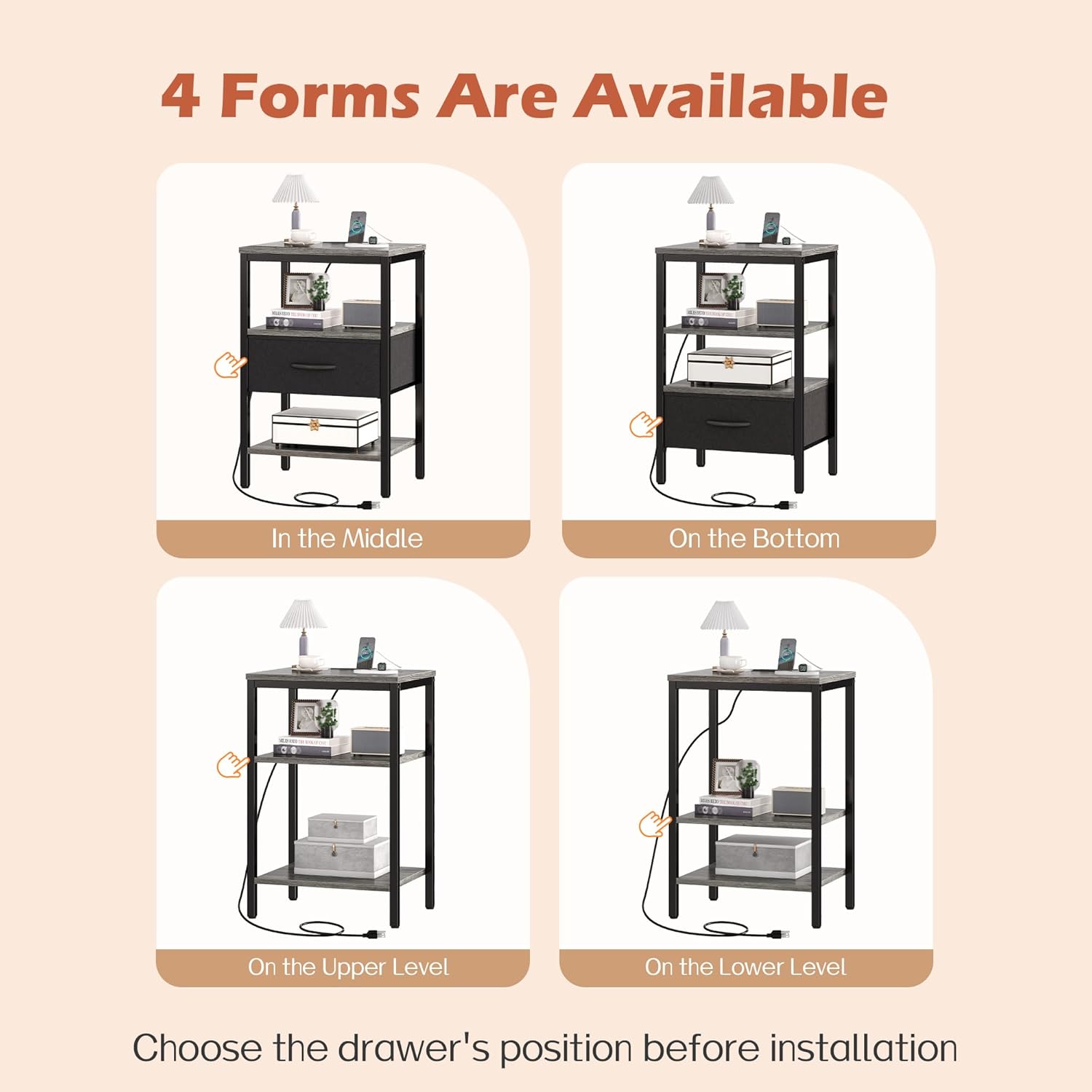 - [Go for a Long Time]: Charcoal gray wooden grain shelves blend black fabric and metal frame, making it a timeless classic. Sturdy P2 particle board, sturdy metal frame, and durable fabric drawer, all these work excellently to give this side table with charging station strong support