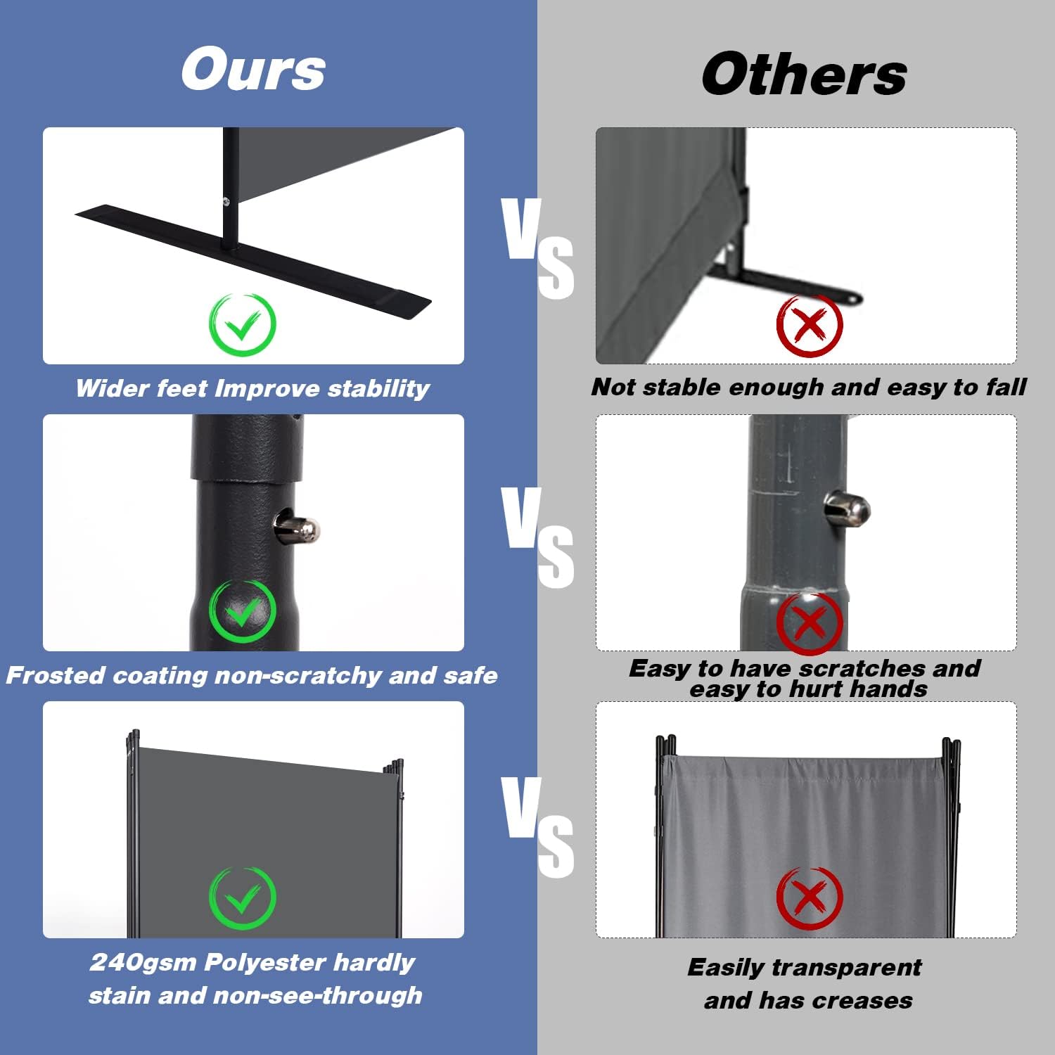 - Upgrades of materials: The panel of wall divider are made of watertight, non-see-through and tear-resistant high density 180g polyethylene fabric . The metal frame of the room divider wall is made of strong iron and powder coating, which increases its rust and wear resistance, and also extends his service life. At the same time widened support feet also increase its stability