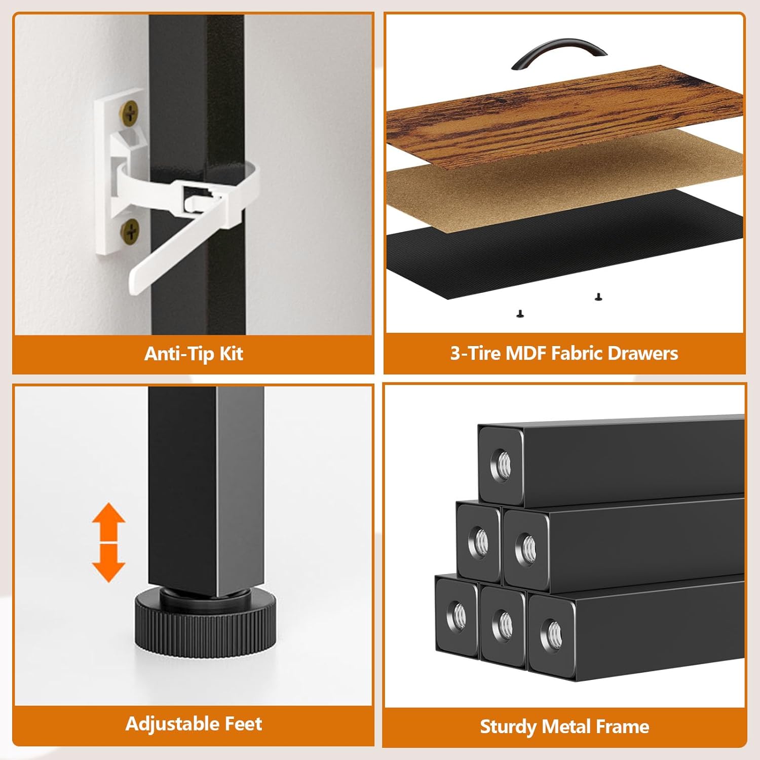 - Safe and Stable : Friendly to young ones, this bedroom dresser with fabric drawers won't pinch hands if little guys want to organize their clothing in drawers. The anti-tip kit to install the tv stand on the wall to provides a safe environment for your family