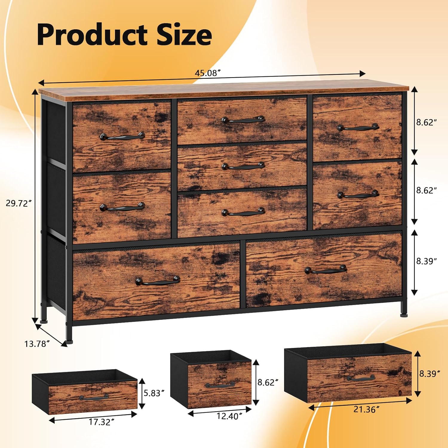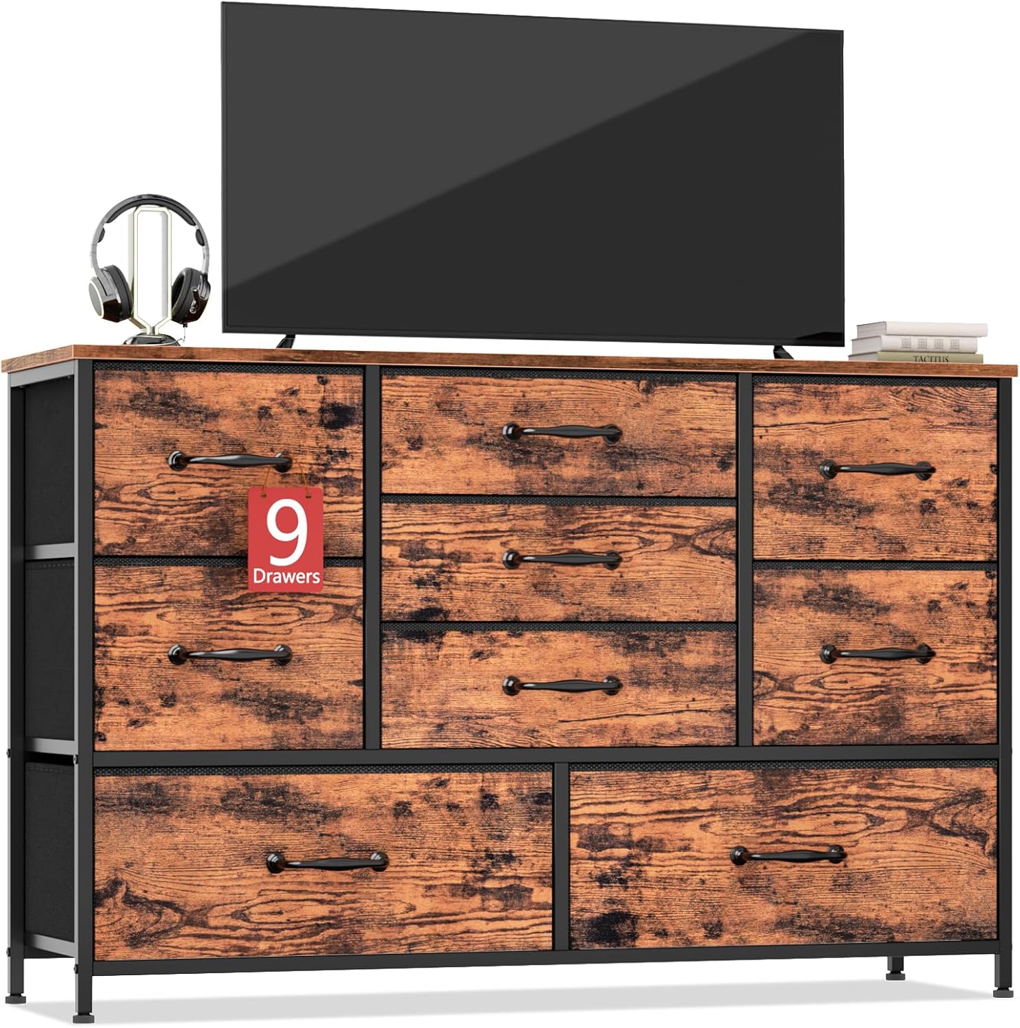 - Large Storage Space: Features 9 removable industrial wide and deep drawers with 10.6 cubic feet storage space. The fabirc dresser is perfect for organizing clothes, blankets, scarves, socks and other accessories. The dimension of the tv stand is 13.78"D x 45.07"W x 29.52"H .Wood tabletop max weight 50 lbs, it is safe enought and wide for TV 55'' as a TV stand dresser console