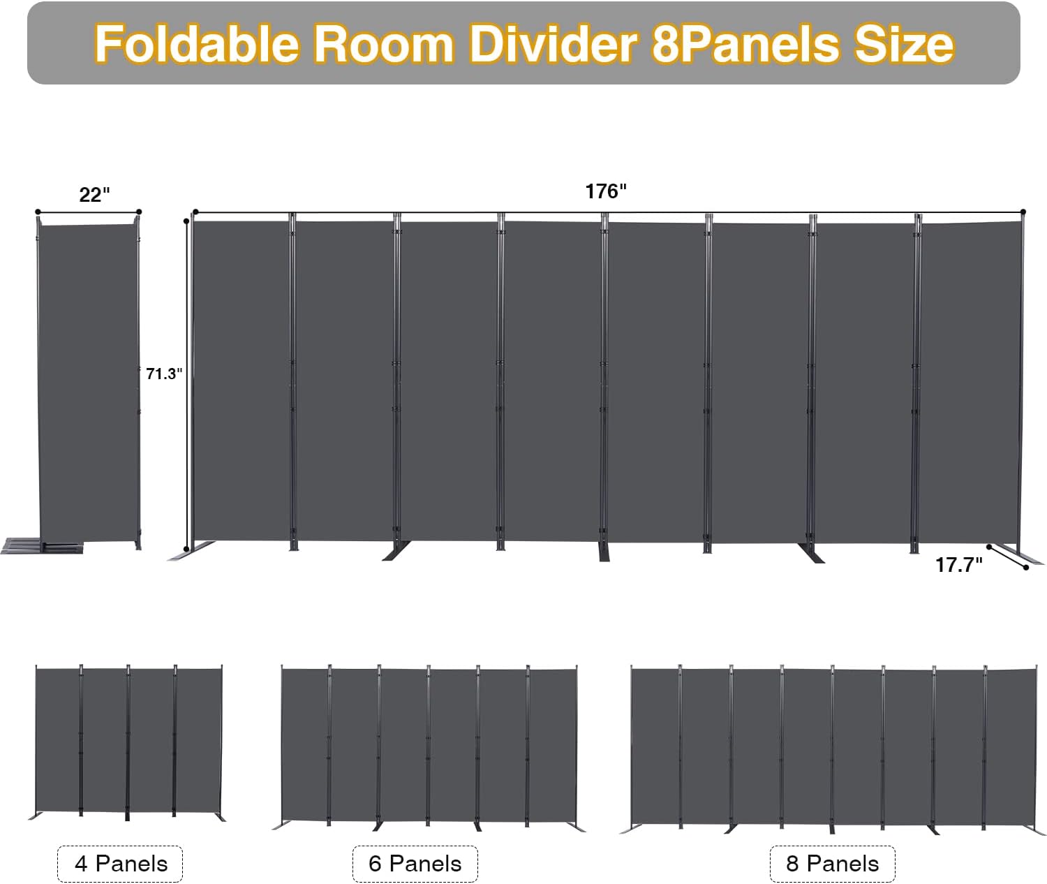 Room Divider, 8 Panel Folding Privacy Screens with Wider Support Feet, 6 Ft Portable Room Partition for Room Separator, 176" W X 71" H, Grey
