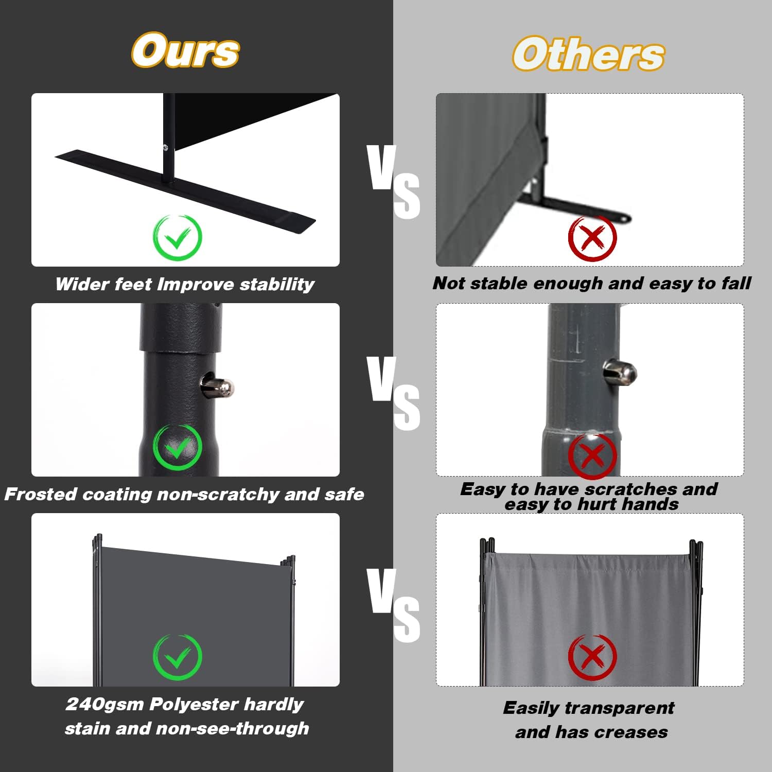 - Upgrades of materials: The panel of wall divider are made of watertight, non-see-through and tear-resistant high density 240g polyethylene fabric . The metal frame of the room divider wall is made of strong iron and powder coating, which increases its rust and wear resistance, and also extends his service life. At the same time widened support feet also increase its stability