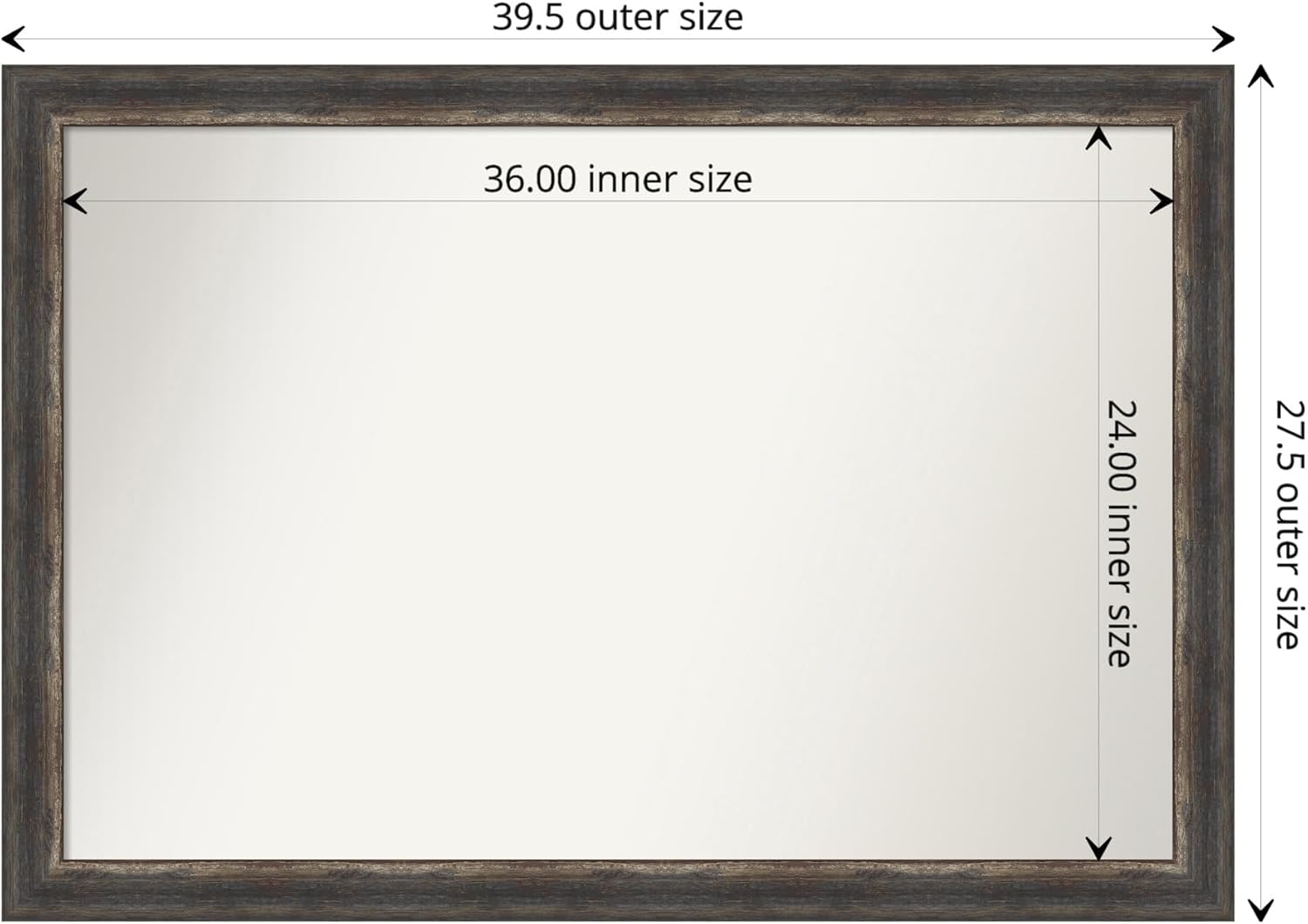 - MIRROR DETAILS: This mirror features premium glass for a clear, undistorted image and has a non-beveled surface to maximize the viewing area. The overall size of this bathroom mirror measures 39.5 x 27.5 inches, including the frame. Its reflective area measures 36 x 24 inches.