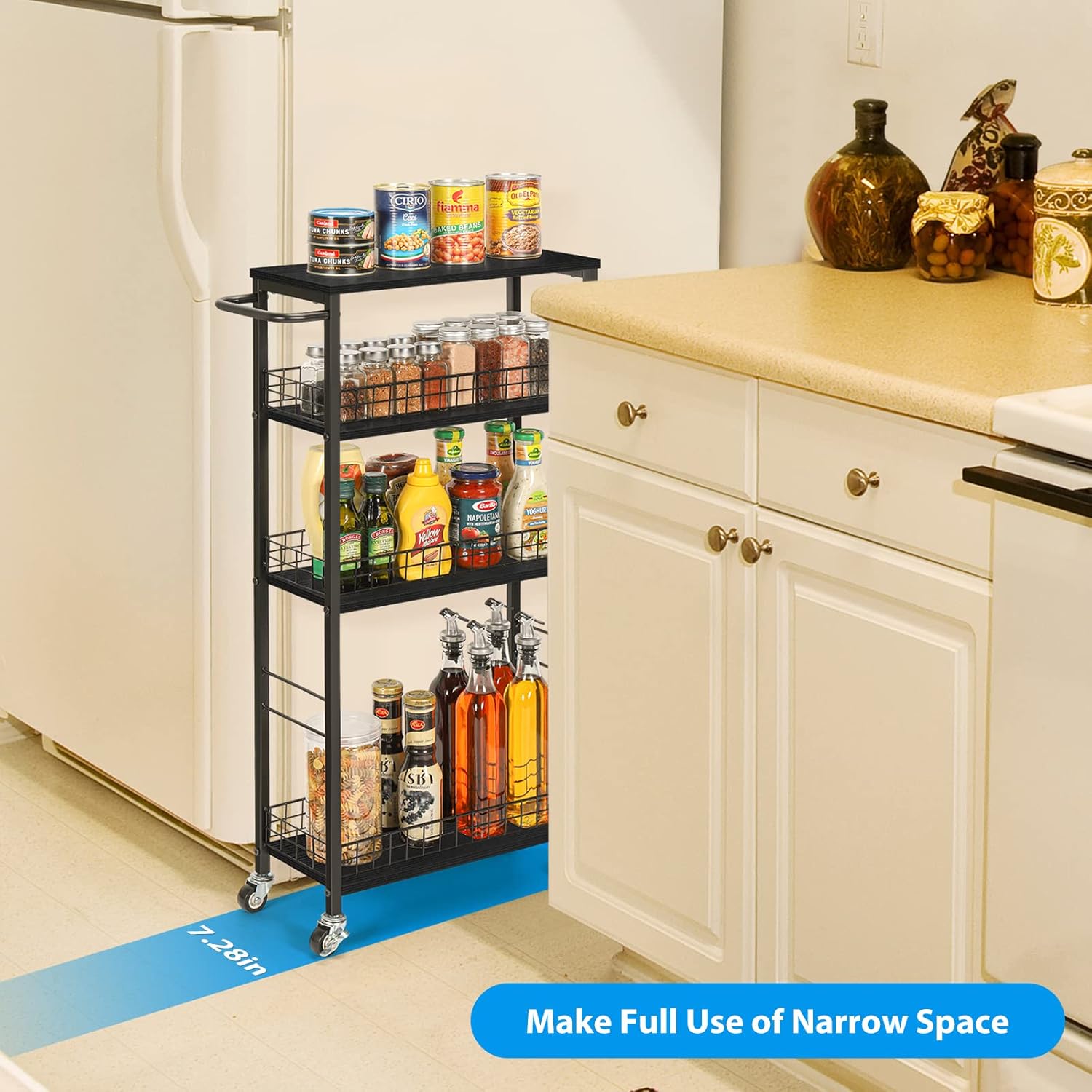 - Four Layer Storage&multipurpose:Each layer of the four-layer slim storage cart has different heights, which makes it possible for you to store spice bottles, cans and flavoring bottles in the kitchen by category. You can also use them as narrow slide-out trolley in bathrooms, snack and beverage carts in bathrooms, living rooms, bedrooms, offices, etc