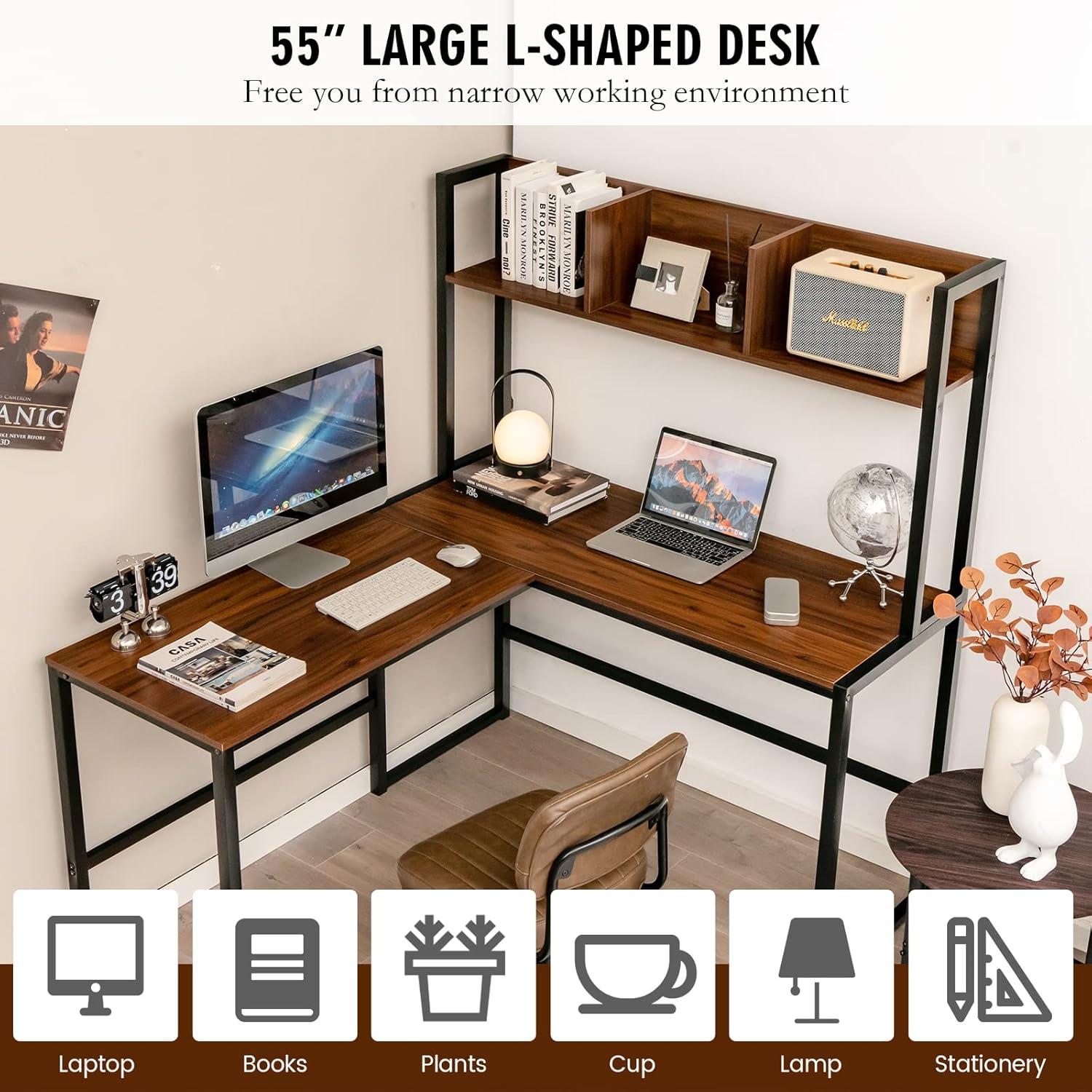 - 【Large L-Shaped Table Top】The L-shaped desk features large work surface to help you keep a tidy table top and thus improve working efficiency. You can display lamp, plants, books and other personal items on the desktop. In addition, L-shaped design offers a perfect solution to those who are in multitasking.