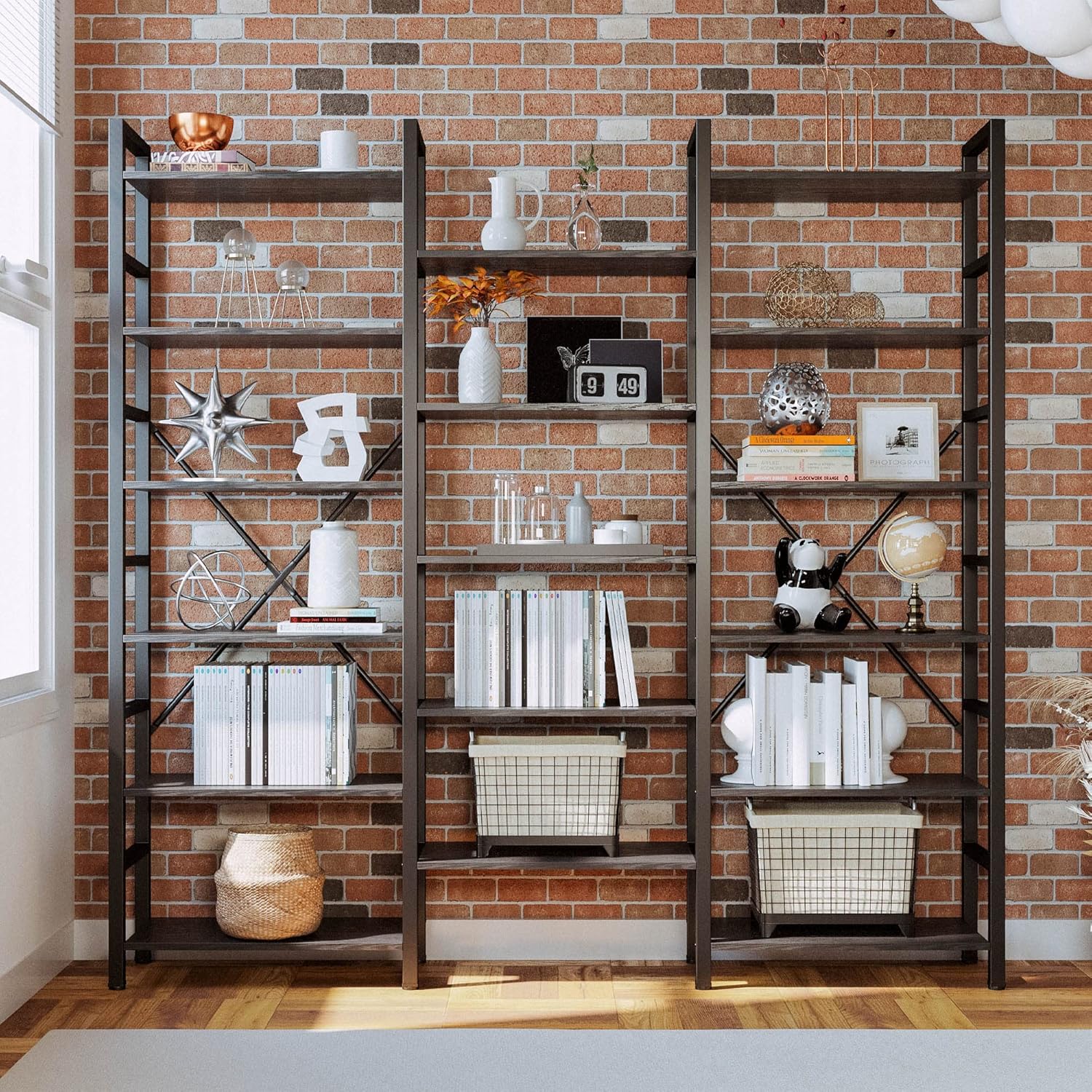 IRONCK Bookshelves 6 Tiers Triple Wide Industrial Bookshelf, Large Etagere Bookshelf Open Display Shelves with Metal Frame for Living Room Bedroom Home Office