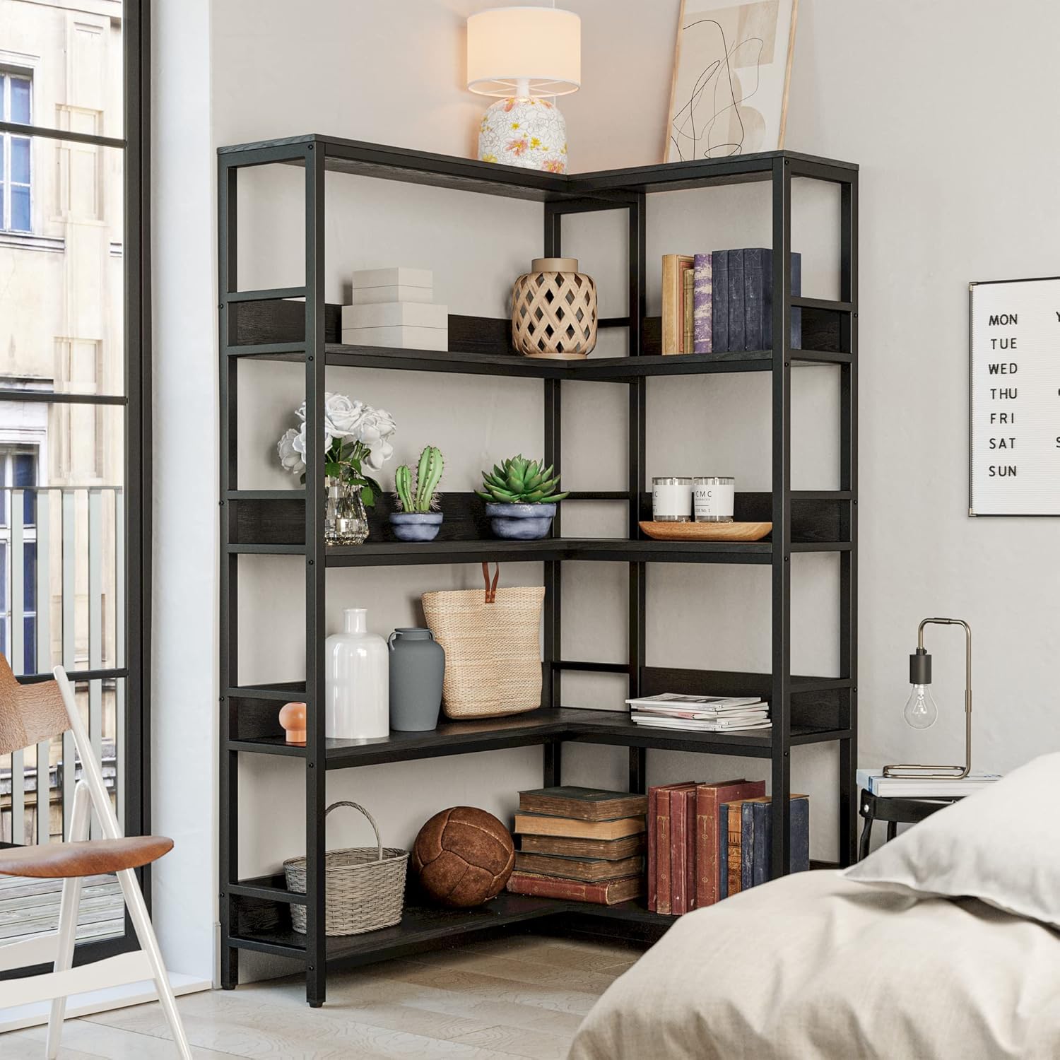 IRONCK Industrial Bookshelves 5 Tiers Corner Bookcases with Baffles Etagere Shelf Storage Rack with Metal Frame for Living Room Home Office