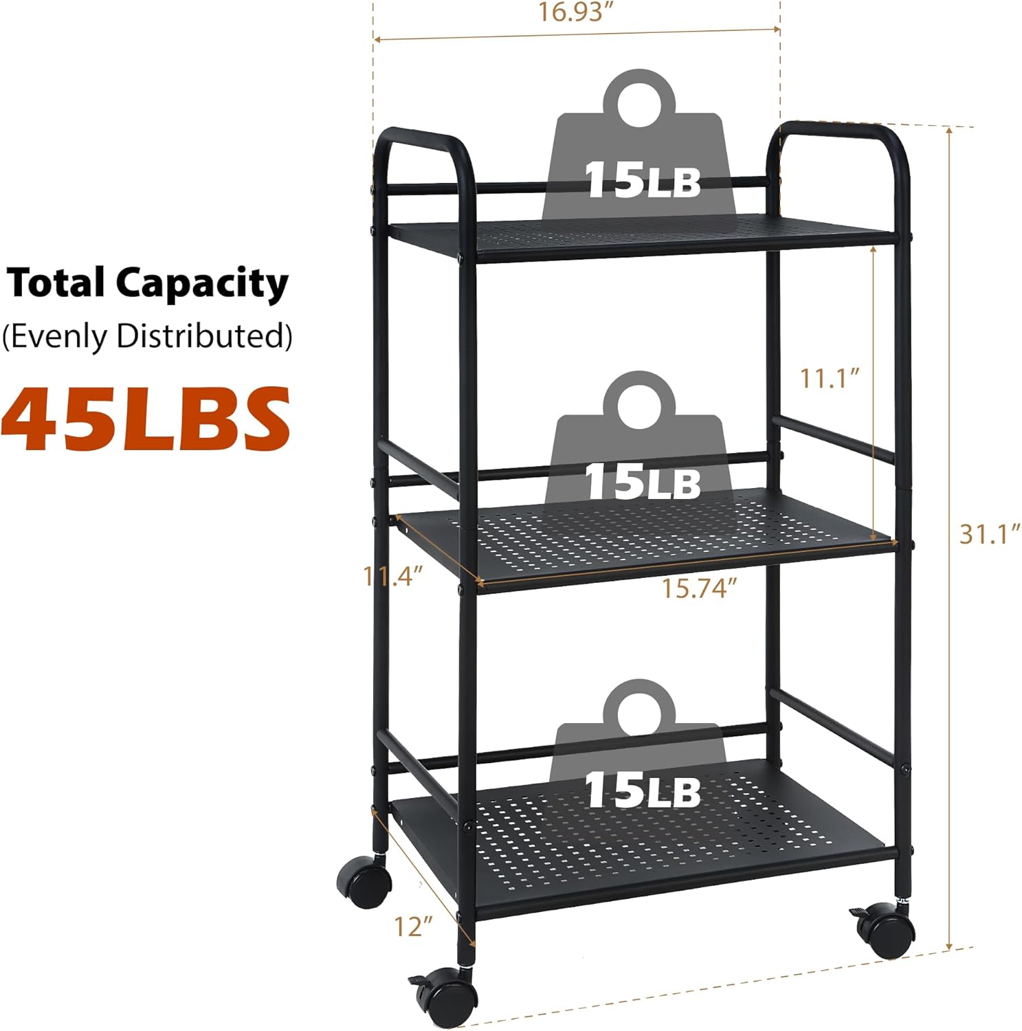 - Spacious 3-Tier Storage Cart – Features a compact footprint (12"D x 16.93"W x 31.1"H) with ample space to store all kinds of products in tight spaces.