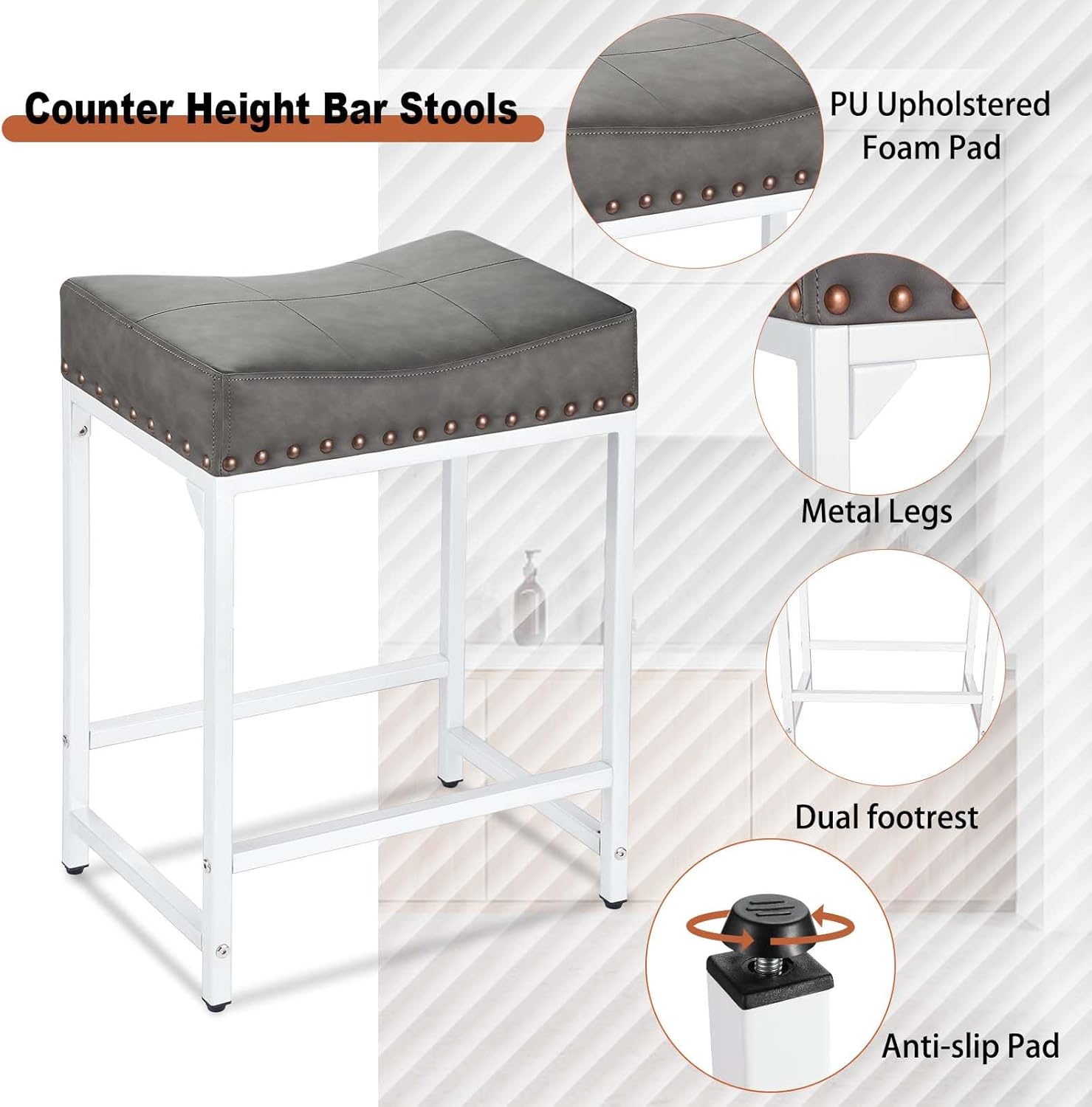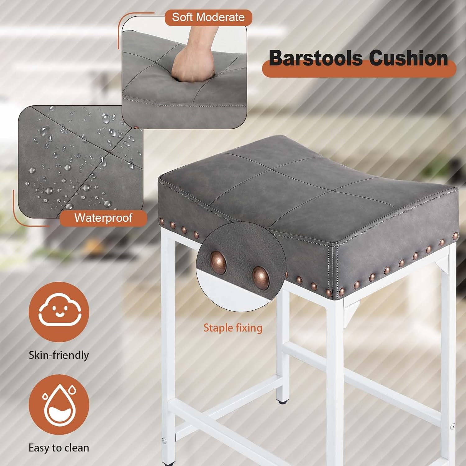 Bar Stools Set of 2, Counter Height Bar Stools with Thick Saddle Cushion and Barstools Metal Frame, 24" Modern Saddle Stool for Bar, Stool for Kitchen Counter Island Pub (Grey+White)