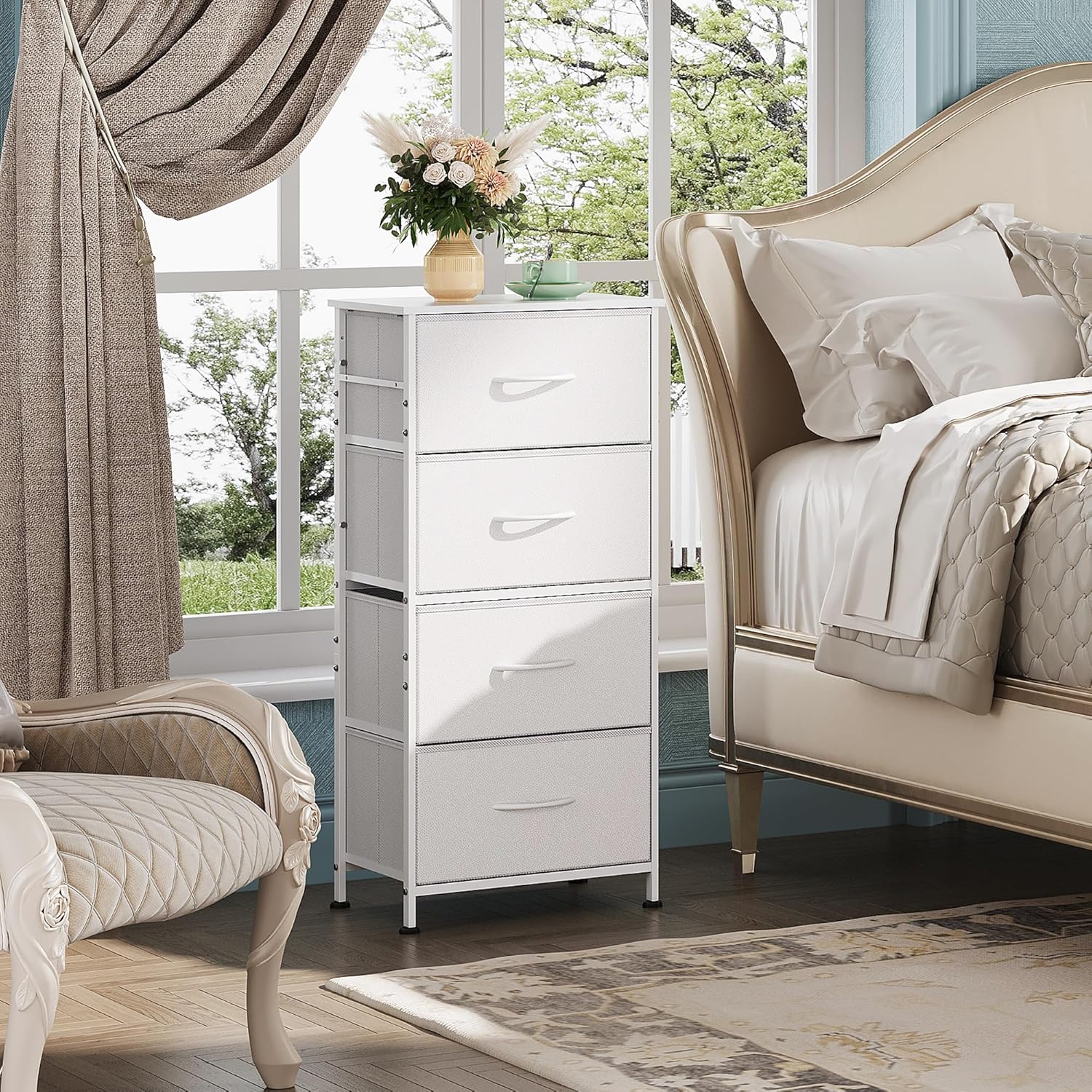 WLIVE Dresser with 4 Drawers, Storage Tower, Organizer Unit, Fabric Dresser for Bedroom, Hallway, Entryway, Closets, Sturdy Steel Frame, Wood Top, Easy Pull Handle, White