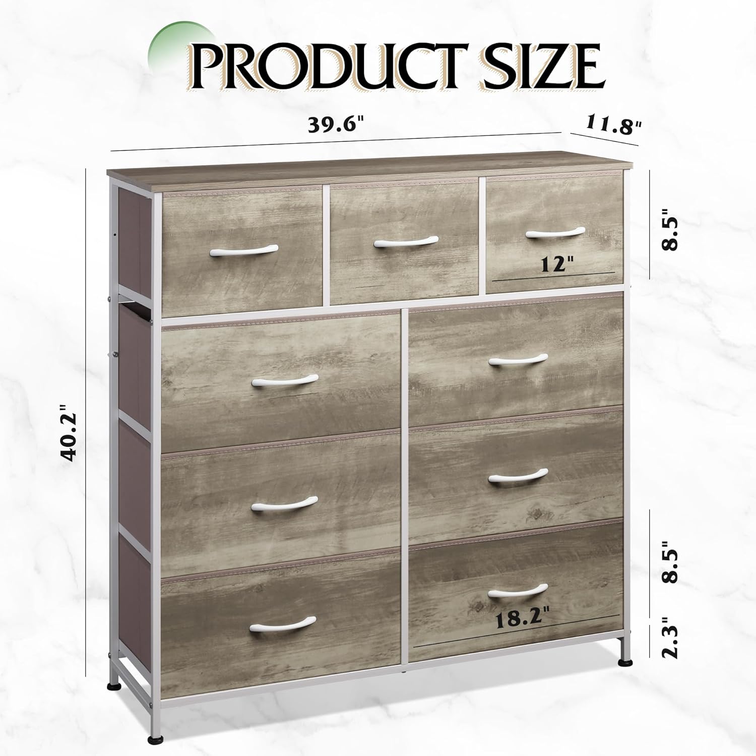 WLIVE 9-Drawer Dresser, Fabric Storage Tower for Bedroom, Hallway, Nursery, Closet, Tall Chest Organizer Unit with Fabric Bins, Steel Frame, Wood Top, Easy Pull Handle, Greige