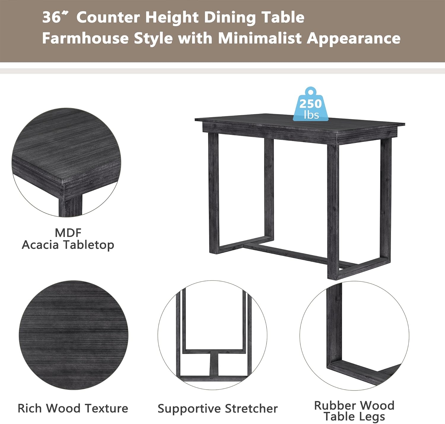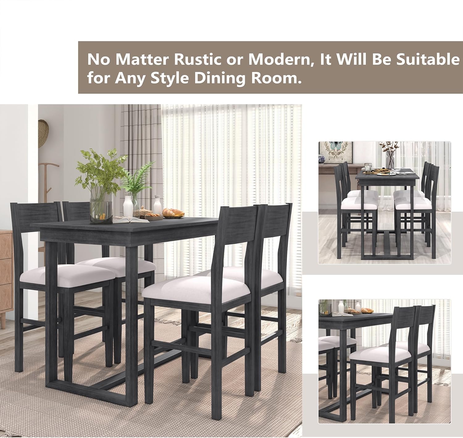 Merax Farmhouse Counter Height 5-Piece Dining Set with 1 Rectangular Table and 4 Upholstered Chairs for Small Places, Family Kitchen Furniture, Gray