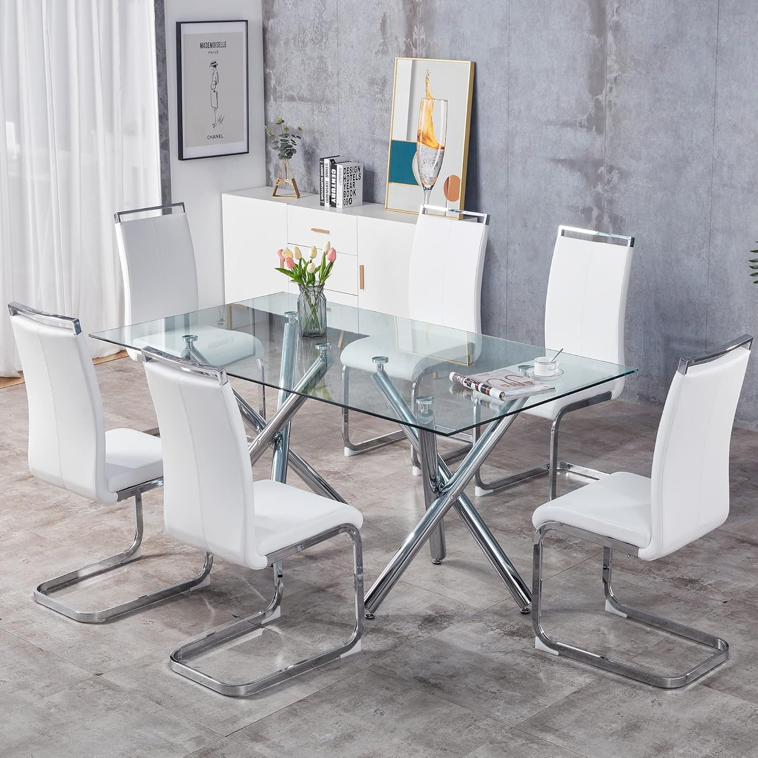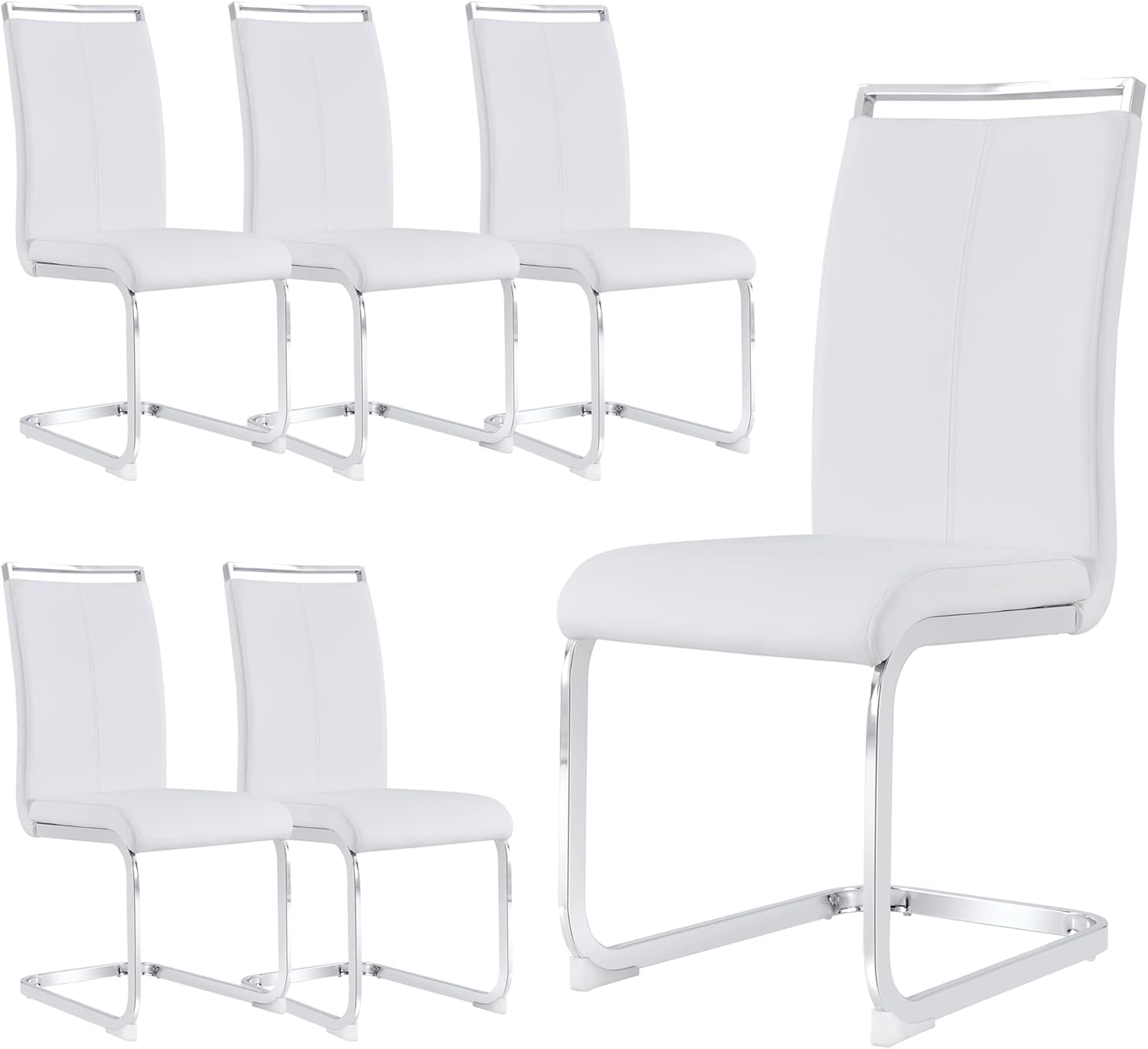 Dining Chairs Set, Kitchen Modern Metal Chairs with Faux Leather Padded Seat High Back and Sturdy Chrome Legs, Chairs for Dining Room (White, Set of 6)