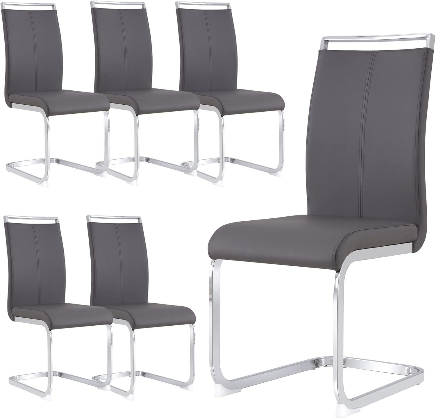 Dining Chairs Set, Kitchen Modern Metal Chairs with Faux Leather Padded Seat High Back and Sturdy Chrome Legs, Chairs for Dining Room (Grey, Set of 6)