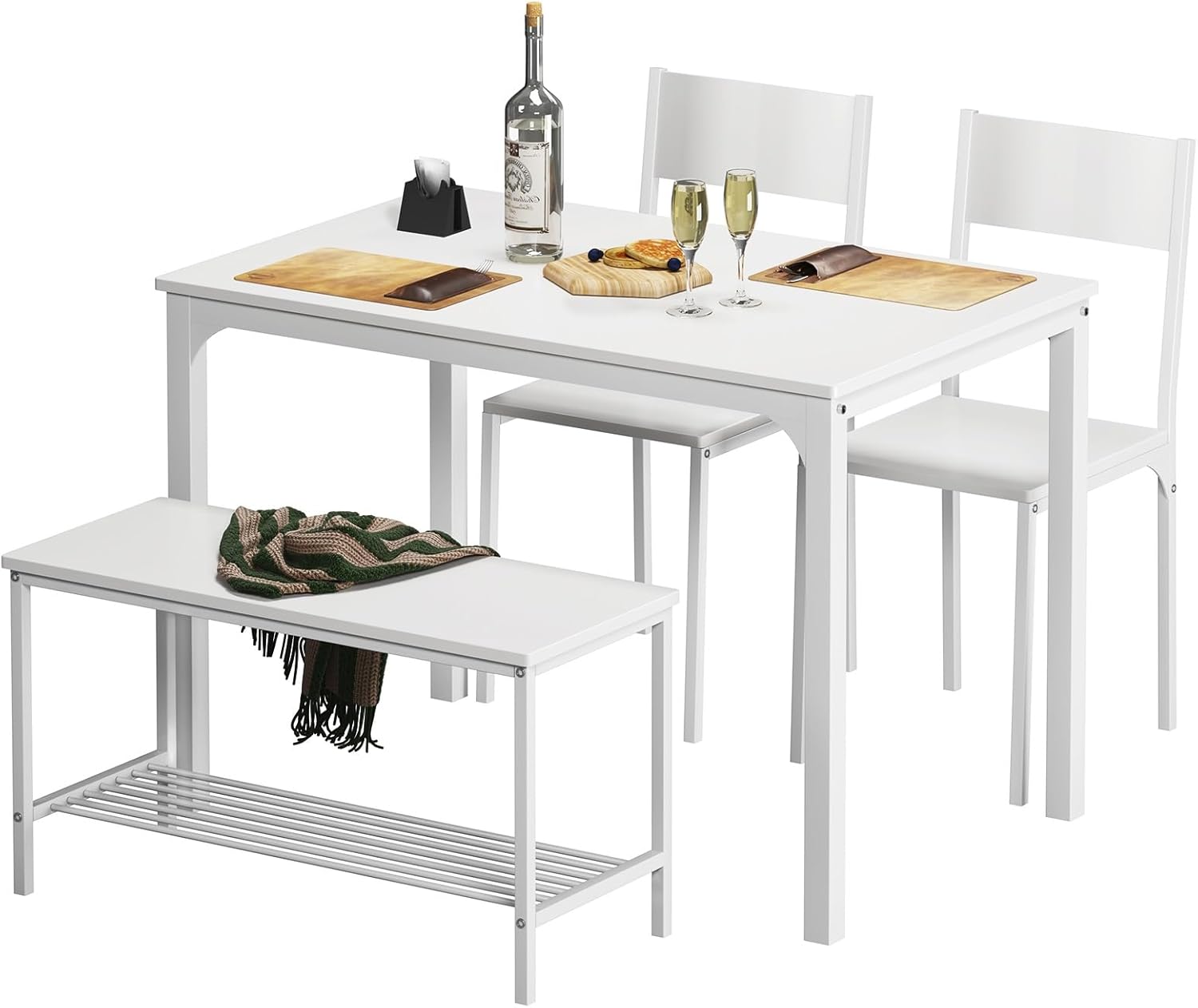 soges 4 Pieces Dining Table Set, 43.3 inch Kitchen Table Set for 4, Dining Set with 2 Chairs and Bench with Storage Rack, Nesting Furniture Set for Dining Room, Kitchen, Restaurant, White