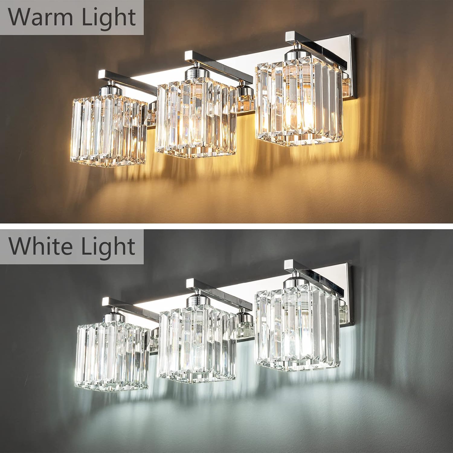 - [High quality manufacturing] Bathroom lights shade is made of clear K9 crystal, base and arm are made of metal, corrosion and moisture resistant, sturdy and durable. Can create a beautiful lighting effect, bathroom vanity lighting simple and luxurious design shows your taste.