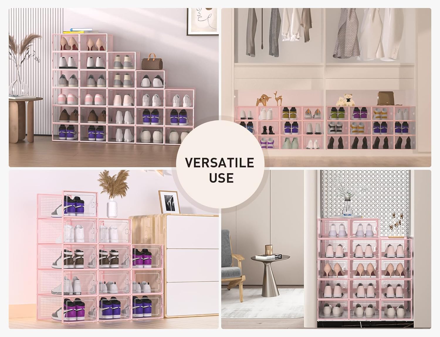 Kuject X-Large Shoe Storage Boxes Organizers Clear Plastic Stackable 12 Pack, Shoe Rack & Holder Substitute, Sneaker Containers, Toy Storage Organizer Bins for Entryway, Closet, Under Bed, Pink
