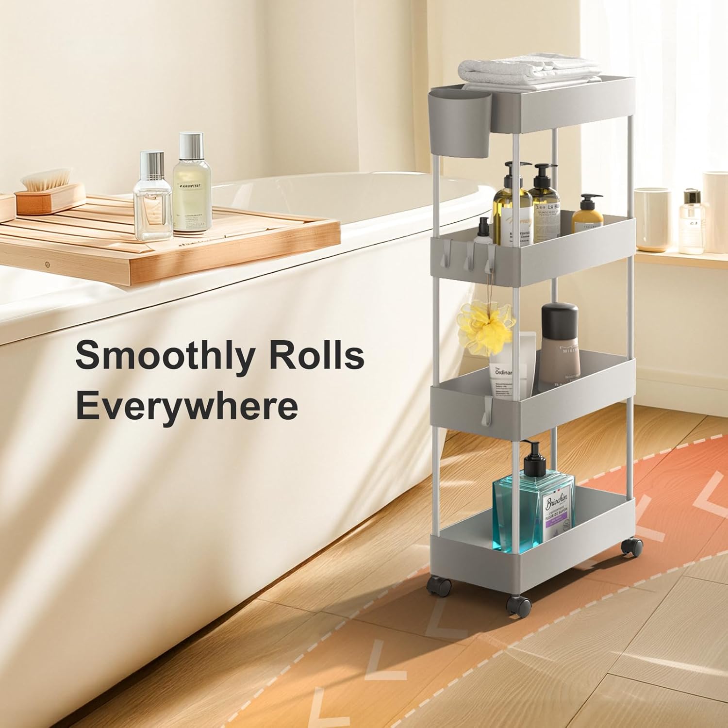 Pipishell Slim Storage Cart with Wheels, 4 Tier Bathroom Storage Organizer Rolling Utility Cart for Bathroom Kitchen Laundry Room Office Narrow Place (Gray)