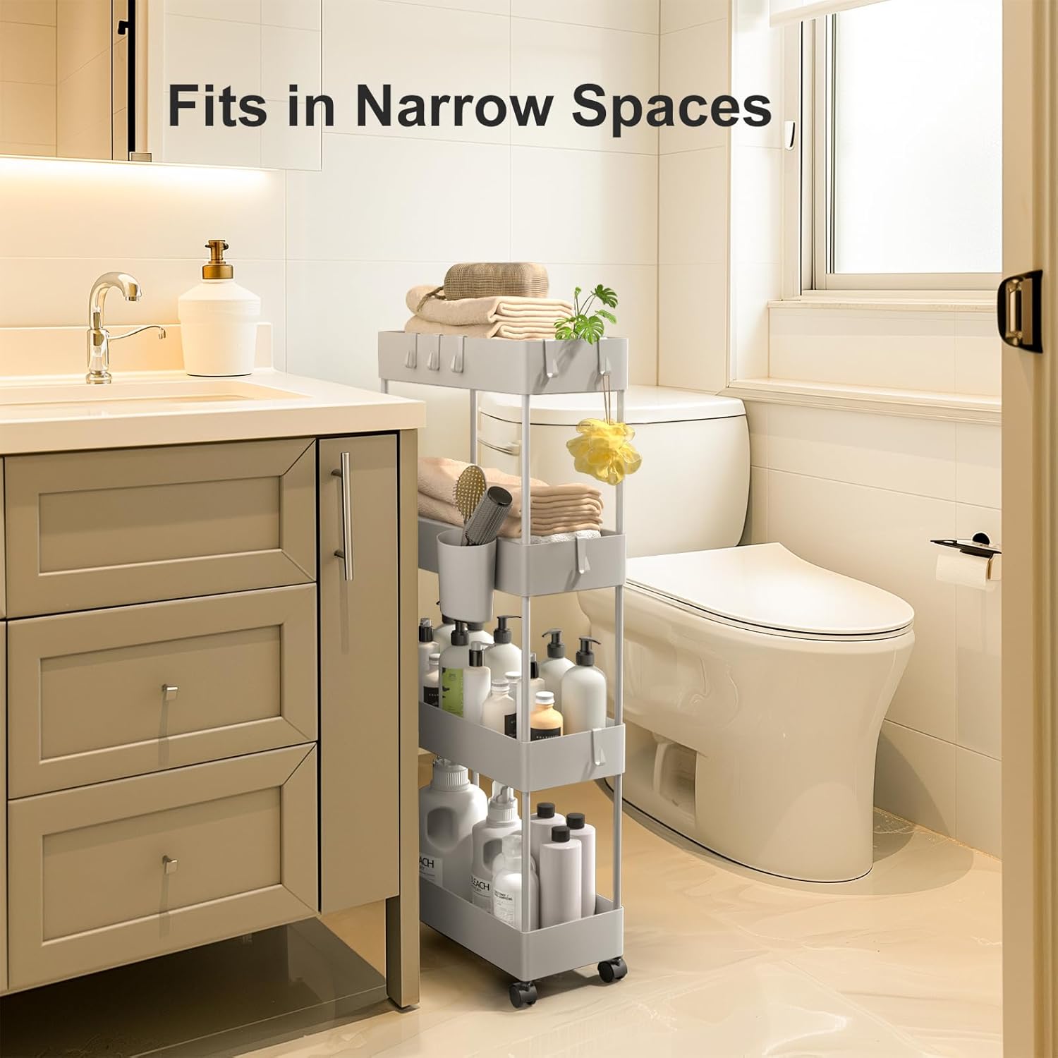 - Perfect for Small Spaces: Need more storage in the bathroom or kitchen? This slim storage cart is only 7.1” wide to fit in small spaces. The slim rolling cart easily turns narrow gaps in your home into useful storage.