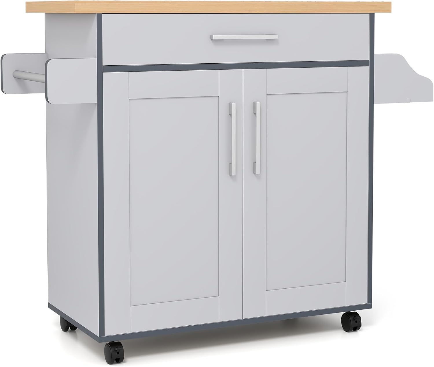 COSTWAY Kitchen Island On Wheels, Rolling Storage Trolley Cart with Large Cabinet, Drawer, Spice Rack and Towel Rack, Kitchen Serving Utility, 3-Position Adjustable Shelf (Grey)