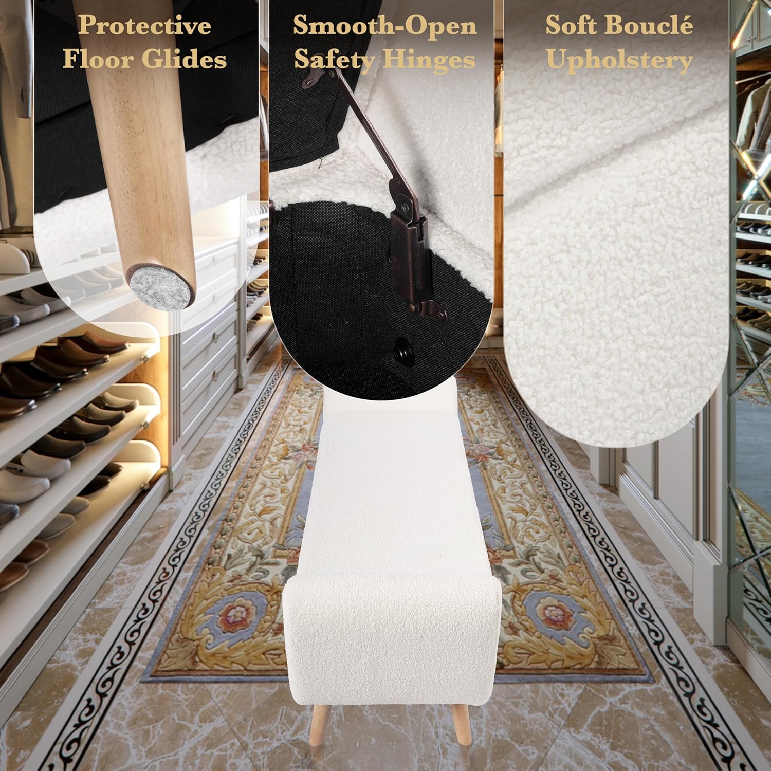 - SHERPA STORAGE BENCH: Crafted with a combination of wood and polyester materials, this entryway storage bench offers durability and comfort. The sturdy wood frame ensures stability, while the polyester upholstery provides a soft and inviting seating experience