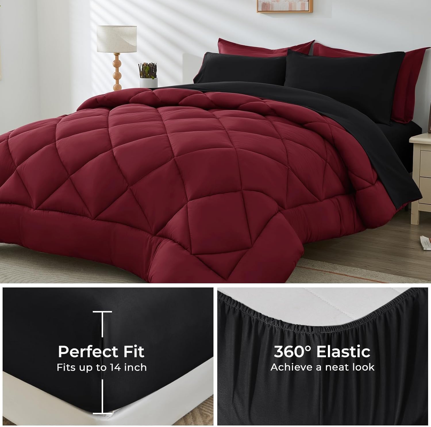 - Practical Details: The 360° elastic fitted sheet with a deep pocket fits most mattresses about 10"-14" deep. The baffle box construction of the comforter prevents the fiber fill from shifting, even after several times of wash
