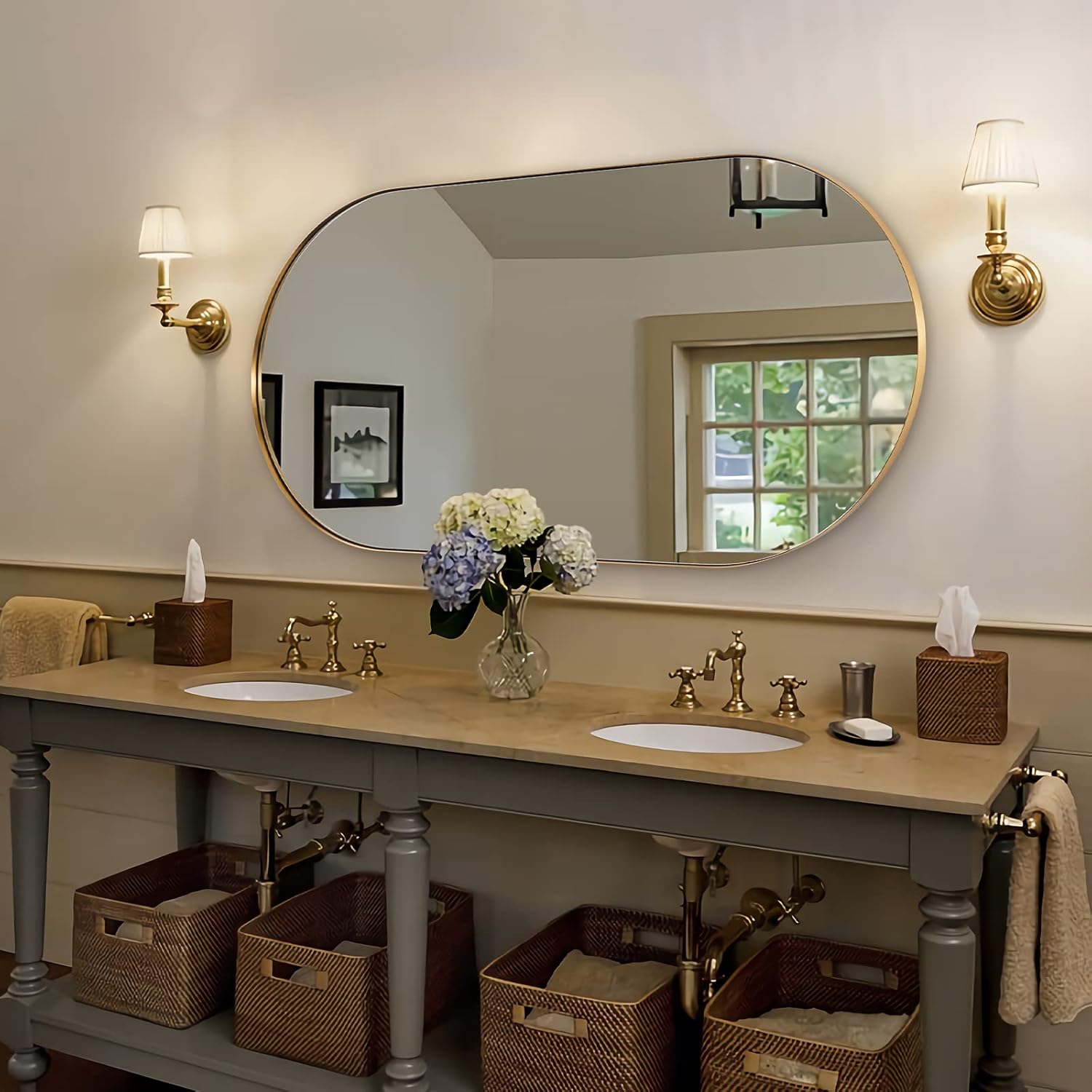 - Modern Elongated Design : Add simple sophistication to any room with our 60x36 inch brass bathroom mirror. The pill-shaped design in brass color will soften your space with its gorgeous look.