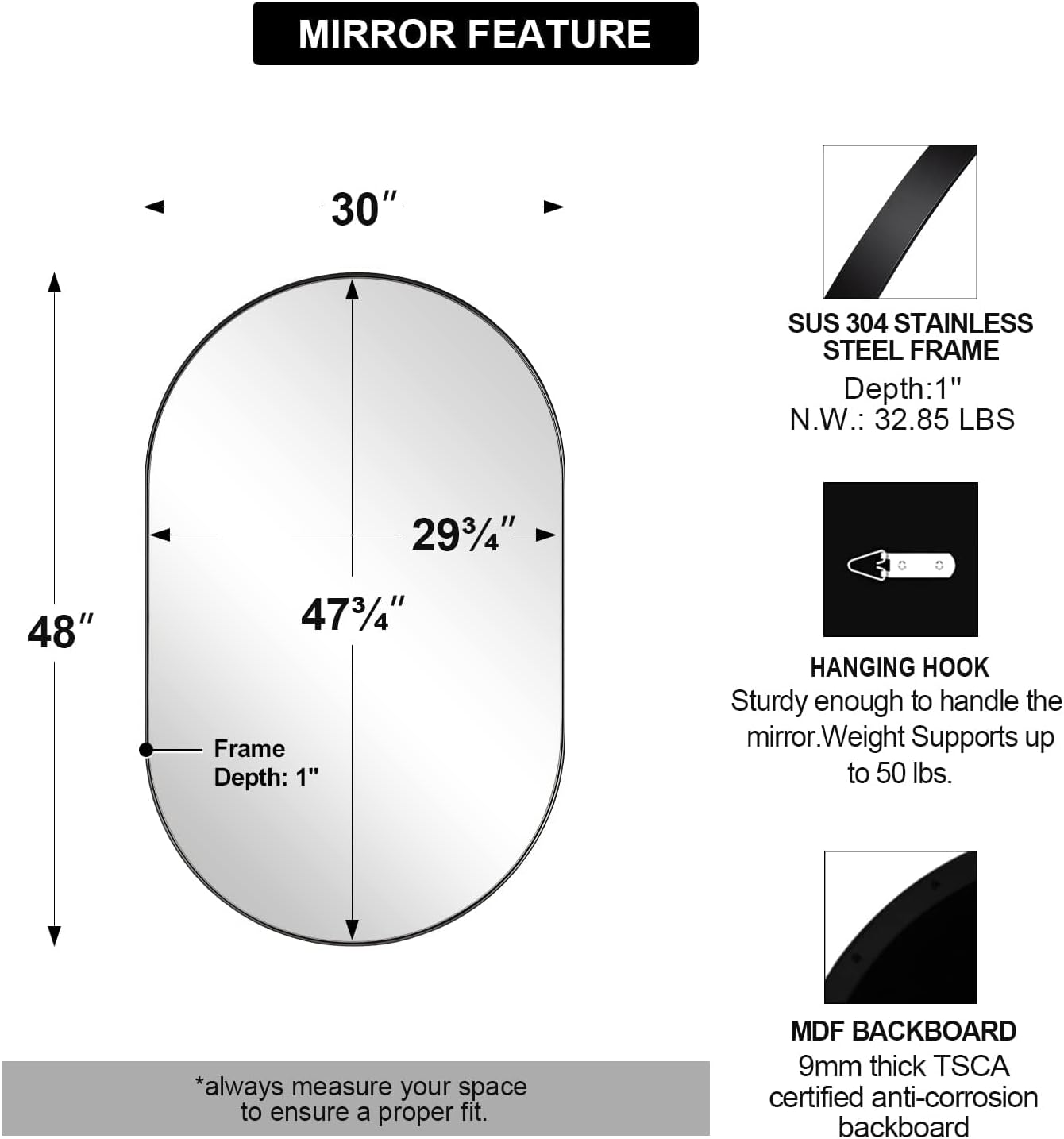 - Premium Quality Material: N.W :(32.85 LBS--Heavy mirror) Made with sleek seamless stainless steel framing that is oxidation-resistant to be rustproof, this black mirrors is built to last. The 4mm HD glass supported by a 9mm MDF backboard is surrounded by the metal frame to be shatterproof
