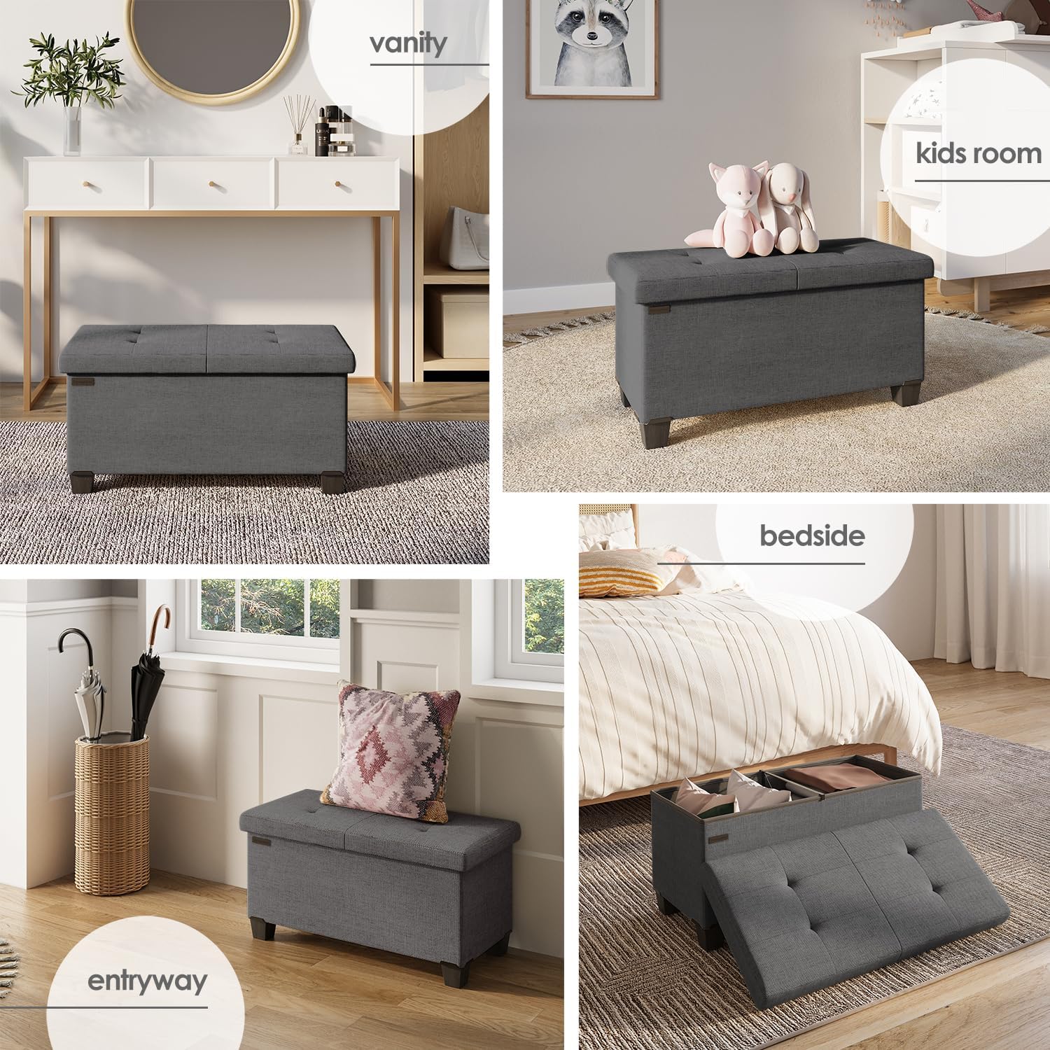 - DURABLE FABRIC OTTOMAN: Organize essentials and accessories with this multipurpose storage ottoman bench that provides you with a comfortable seat for putting on socks and shoes, while making a statement as an end of bed storage bench or entry bench with storage.