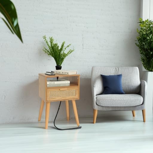 MaxSmeo Mid Century Modern Nightstand with Charging Station, Bedside Tables with Rattan Drawer, Small Wood Nightstand Side Table for Living Room,Bedroom (Brown)