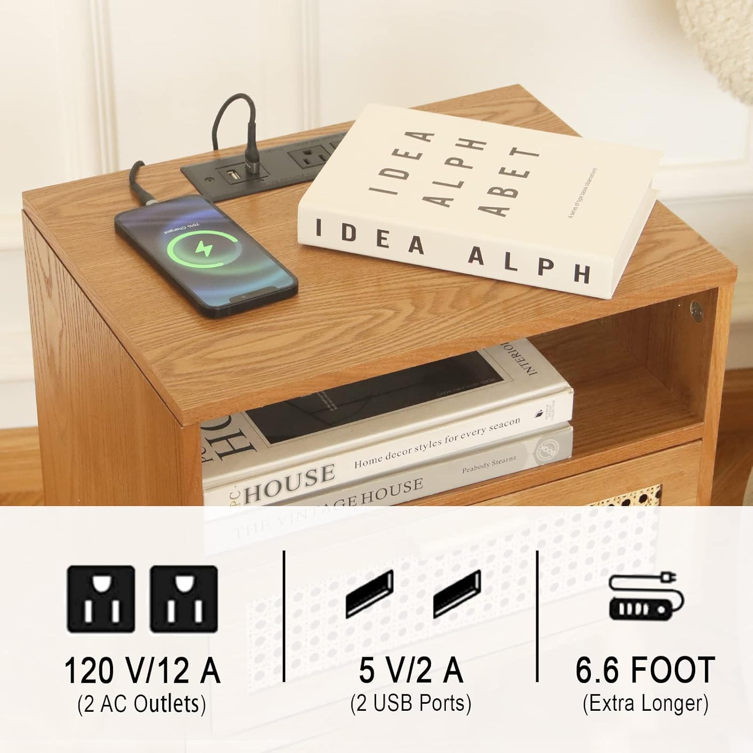 - Bedside Tables with Charging Station: The plug contains 2 3-Prong Power outlets and 2 USB ports. It's easy to charge your phone, computer, any electric device etc. The power cod is 6.6 ft long, everything is within your arm's reach