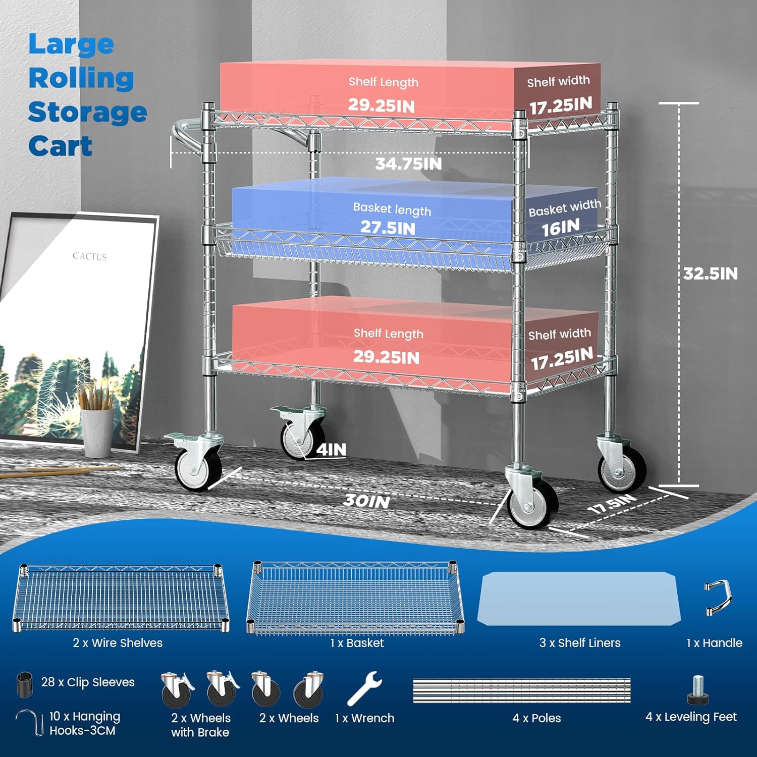Leteuke Heavy Duty 3 Tier Rolling Utility Cart,NSF Certified 990Lbs Capacity Rolling Carts with Wheels,Commercial Grade Metal Cart with Handle Bar & Shelf Liner,Trolley Serving Cart for Kitchen,Chrome