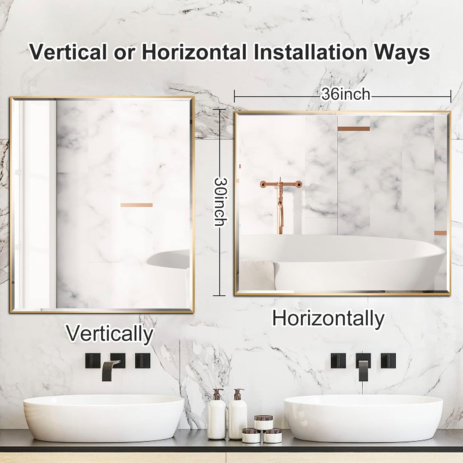30x36 Inch Gold Mirror with Beveled Trim, Aluminum Frame Bathroom Vanity Mirror, Copper-Free Mirror, Rectangle Wall Mounted Mirror, Modern Rectangular Mirror Horizontal or Vertical