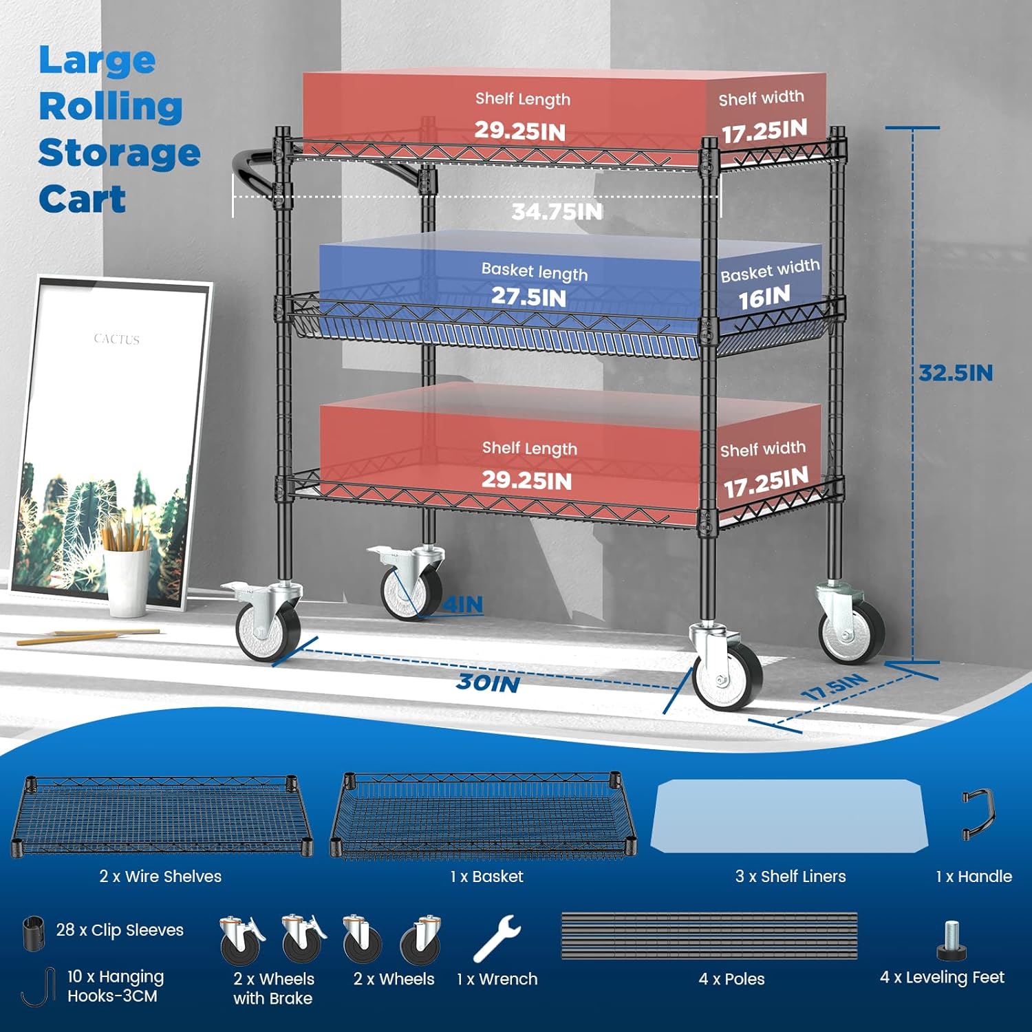 Leteuke 3 Tier Rolling Carts with Wheels,990Lbs Heavy Duty Rolling Utility Cart,NSF Commercial Grade Metal Cart with Handle&Shelf Liner,Trolley Serving Cart for Kitchen,Restaurant,Plant Display,Black