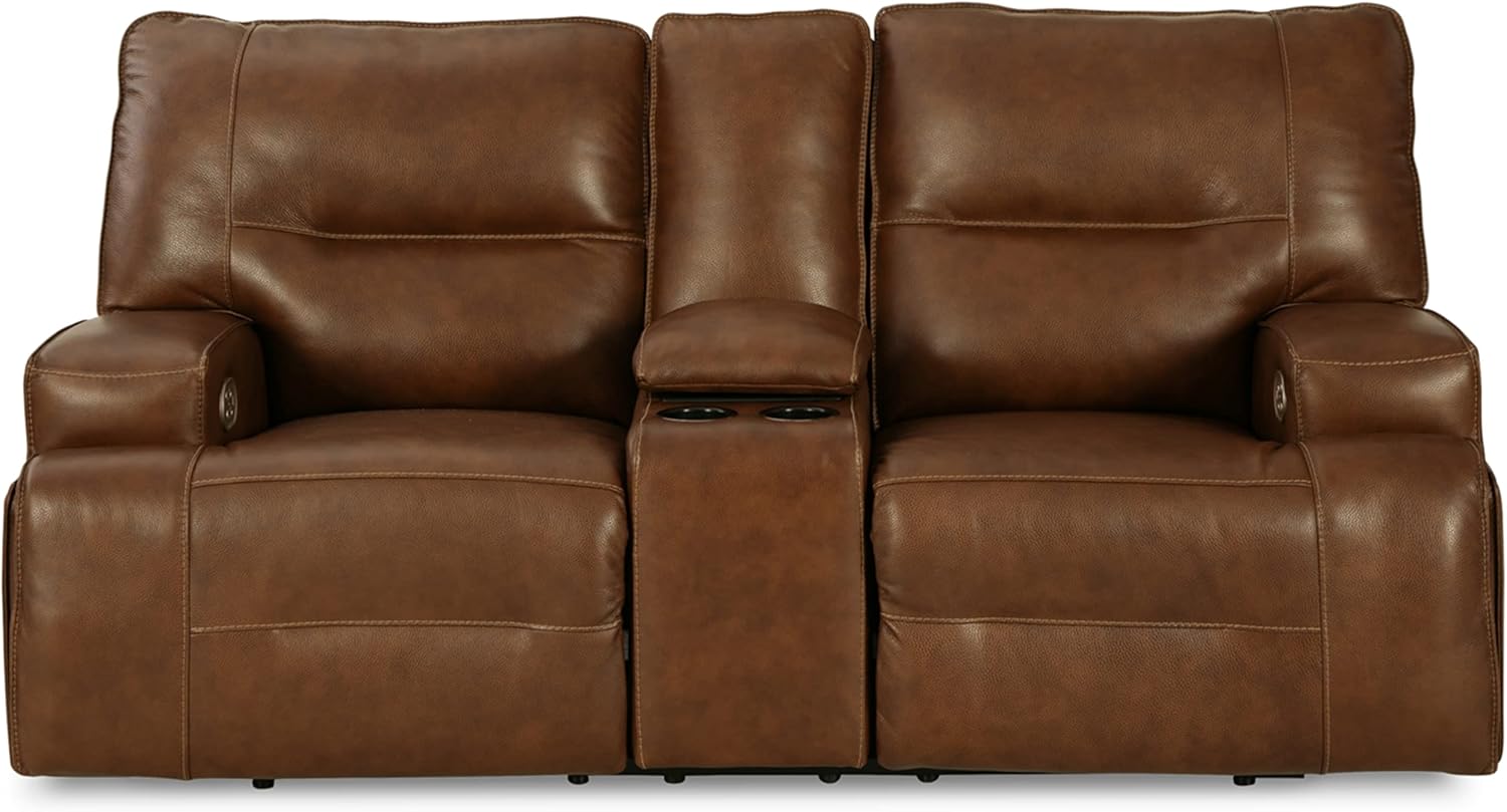 Signature Design by Ashley Francesca Modern Tufted Leather Power Reclining Loveseat with Console and Adjustable Headrest, Dark Brown