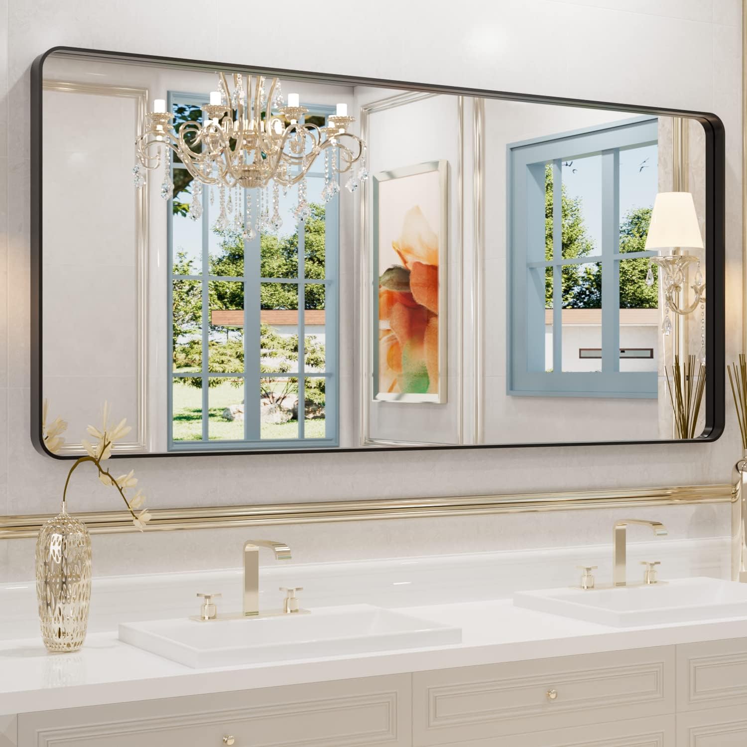 - 【Durable Black Metal Framed Mirror】: WEER black bathroom vanity mirror is made of premium alumium alloy frame, which is anti-rust and non-deformed. Practical rectangle rounded corner mirror with simple classic clean line features the modern and industry style;