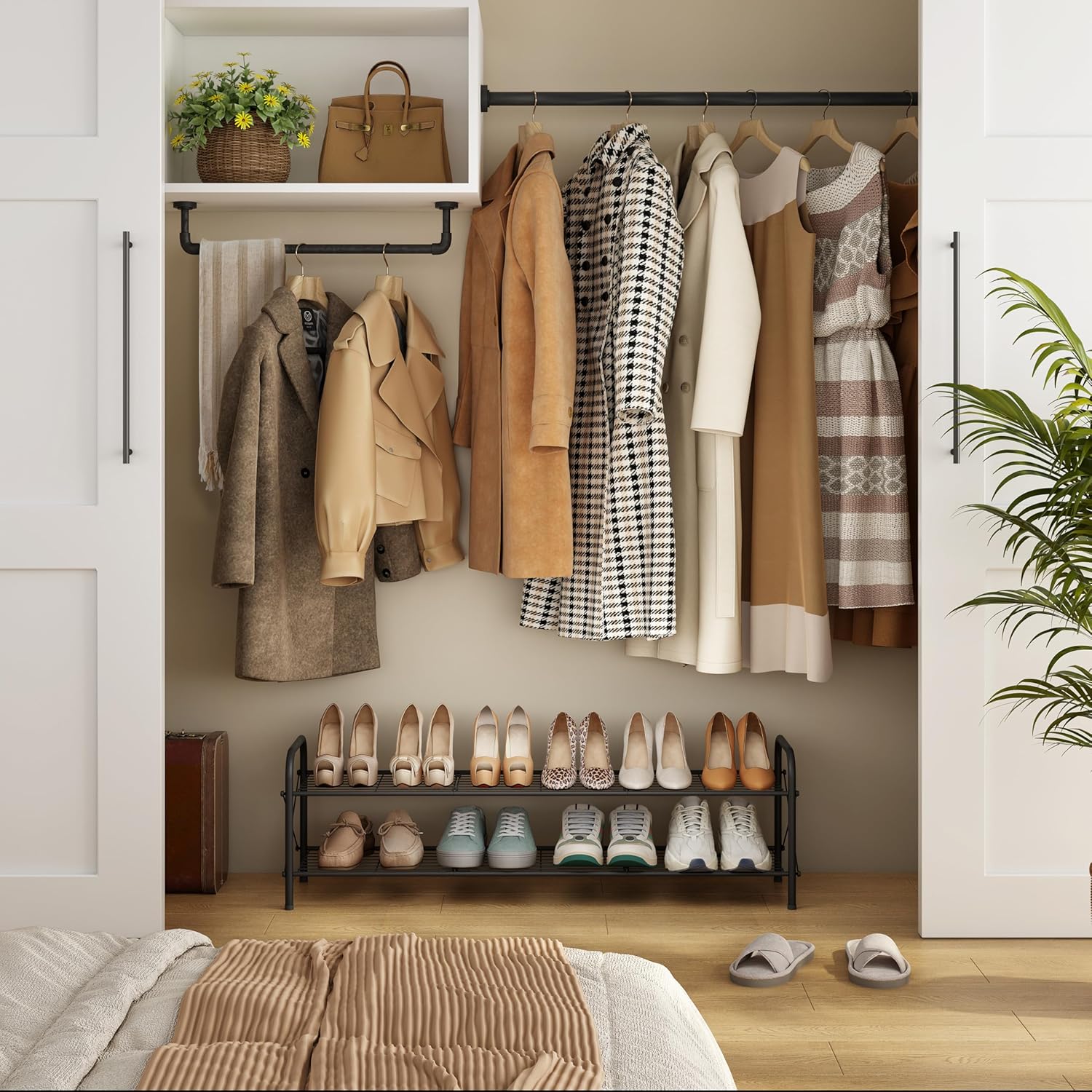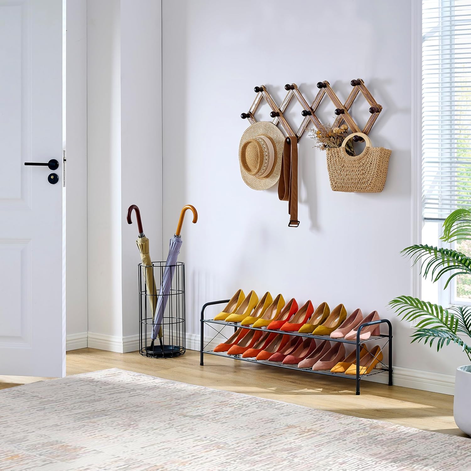 - ă2-Tier Designă: Two-layer shoe rack design is easy to use and maximizes storage space. You can arrange boots or shoes according to the height of each layer to keep your shoes organized and tidy. Say goodbye to the messy and unorganized arrangement.