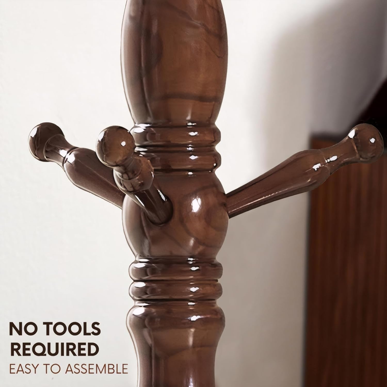 - 【Thoughtful Design】This coat hanger has 9 hooks, and all edges are well polished and no burrs, make sure your clothes won't slip off or get hooked; 360° full angle freestanding hanging; this wooden coat rack stand is great for you and your family