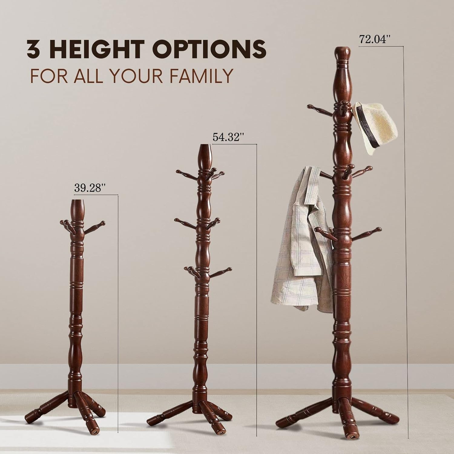 Coat Rack, Natural Wood Coat Racks with 3 Height Options and 9 Hooks,Coat Tree Ease of Assembly,Freestanding Hall Tree for Home/Office/Entryway/Hallway (Walnut)