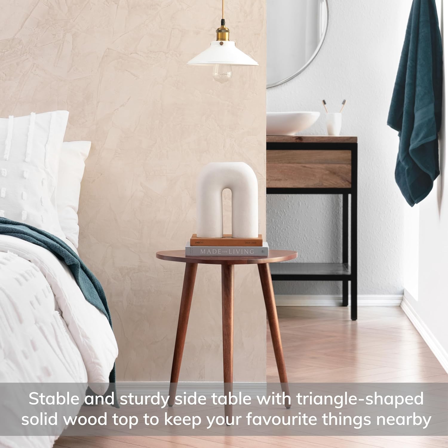 - STURDY MINIMALIST DESIGN TRIANGLE-SHAPED END TABLE - exclusively designed by MH London and inspired by mid-century furniture, this modern mini end table has a solid wood top and strong tapered 3 legs - ideal to keep drinks, books or a lamp close at hand