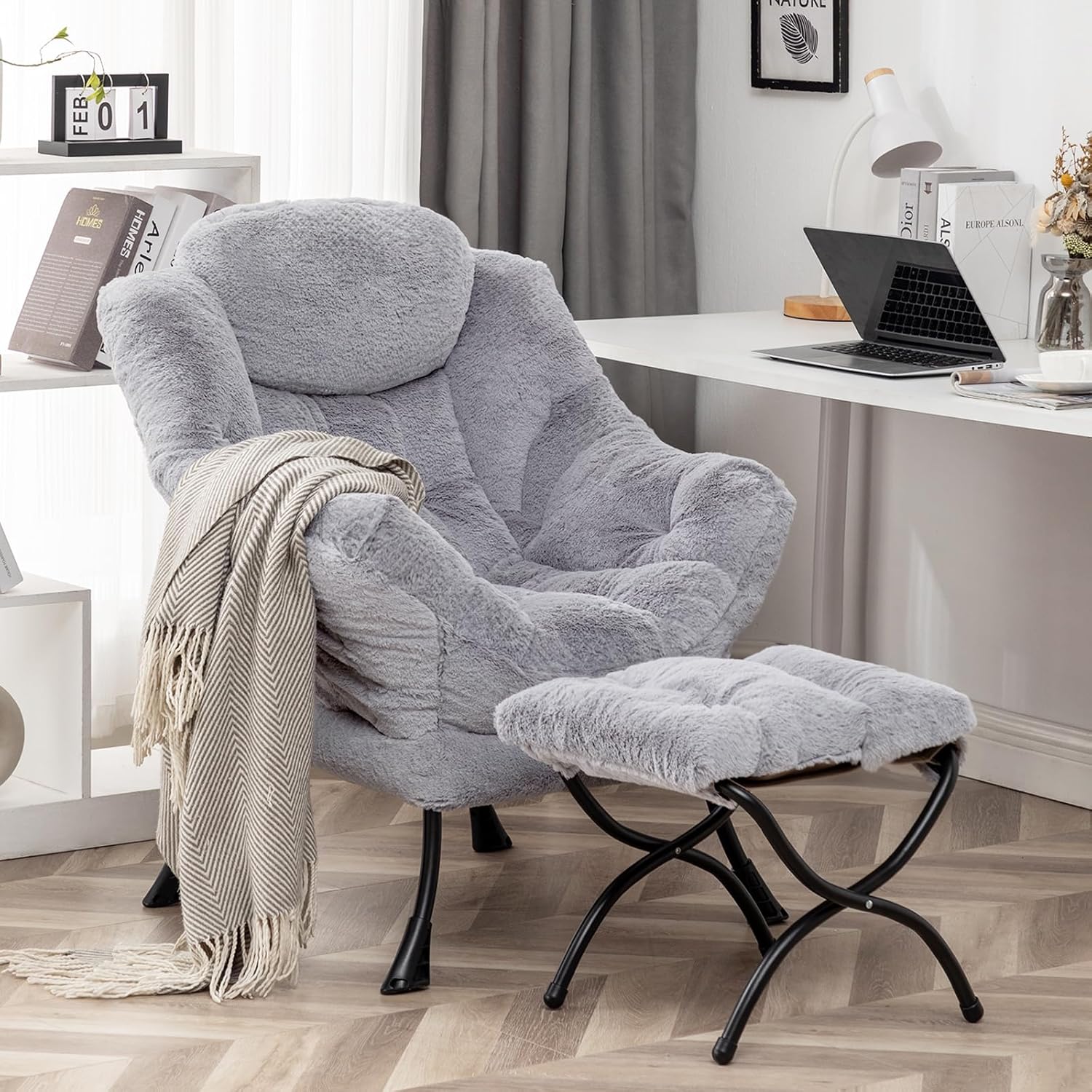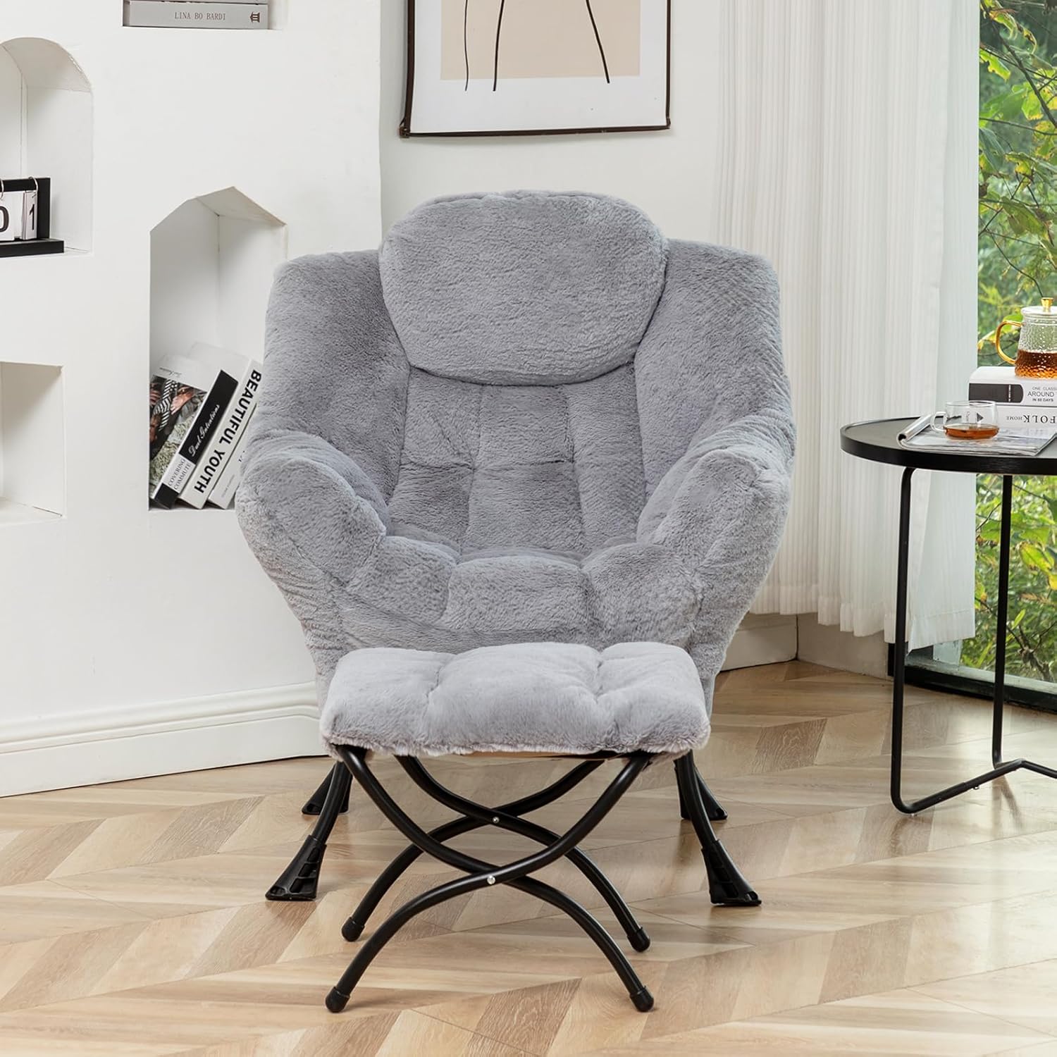 Lazy Chair with Ottoman, Modern Accent Lounge Leisure Sofa with Armrests, Reading Chair and Folding Footstool for Living Room, Bedroom, Office, Plush Grey