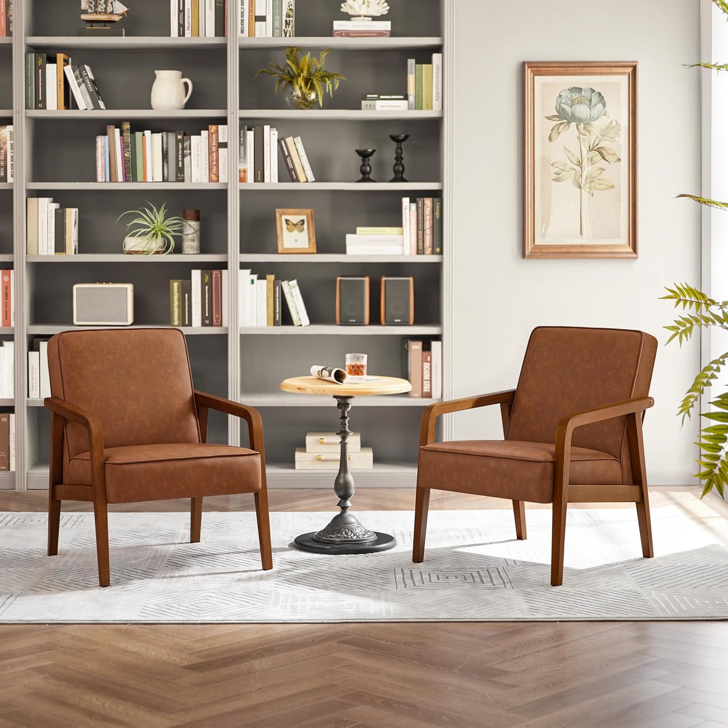 - Mid-century Modern Vibe: The streamlined silhouette and sculptural wood legs of this living room chair set strikes a subtle mid-century modern style. Faux leather upholstery resembles the unique appearance of crazy horse leather, lending a touch of retro elegance to your home. No tufted trims keep the silhouette more sleek