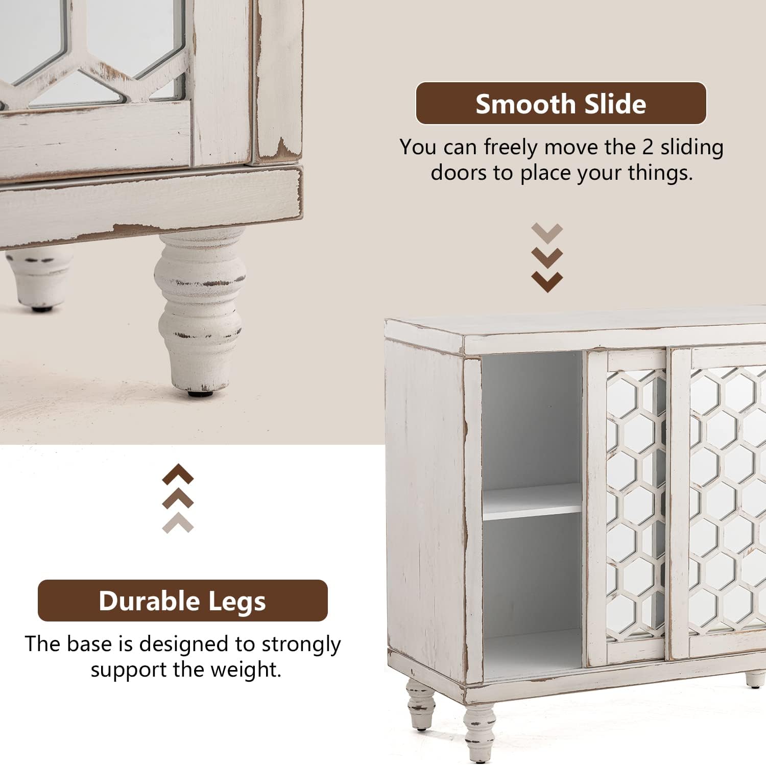 COSIEST 31.5" W Sideboard Buffet Cabinet with Mirrored Doors and Adjustable Shelf, Kitchen Storage Cabinet with Sliding Doors for Dining Room, Hallway, Living Room (White, Honeycomb Pattern)